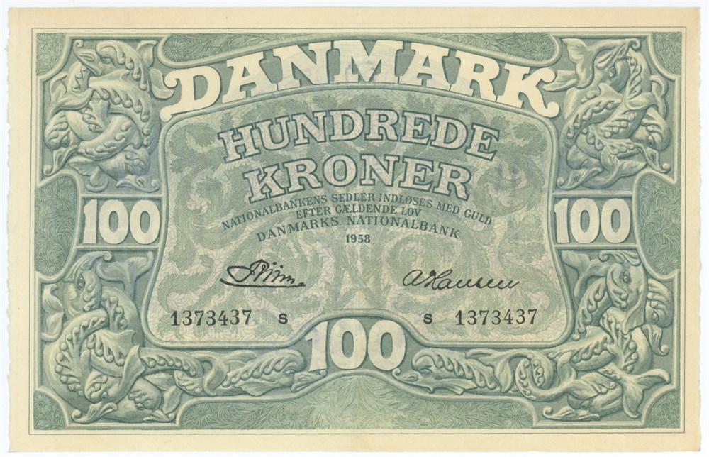 100 kroner 1958 s, nr. 1373437, Riim / A. Hansen