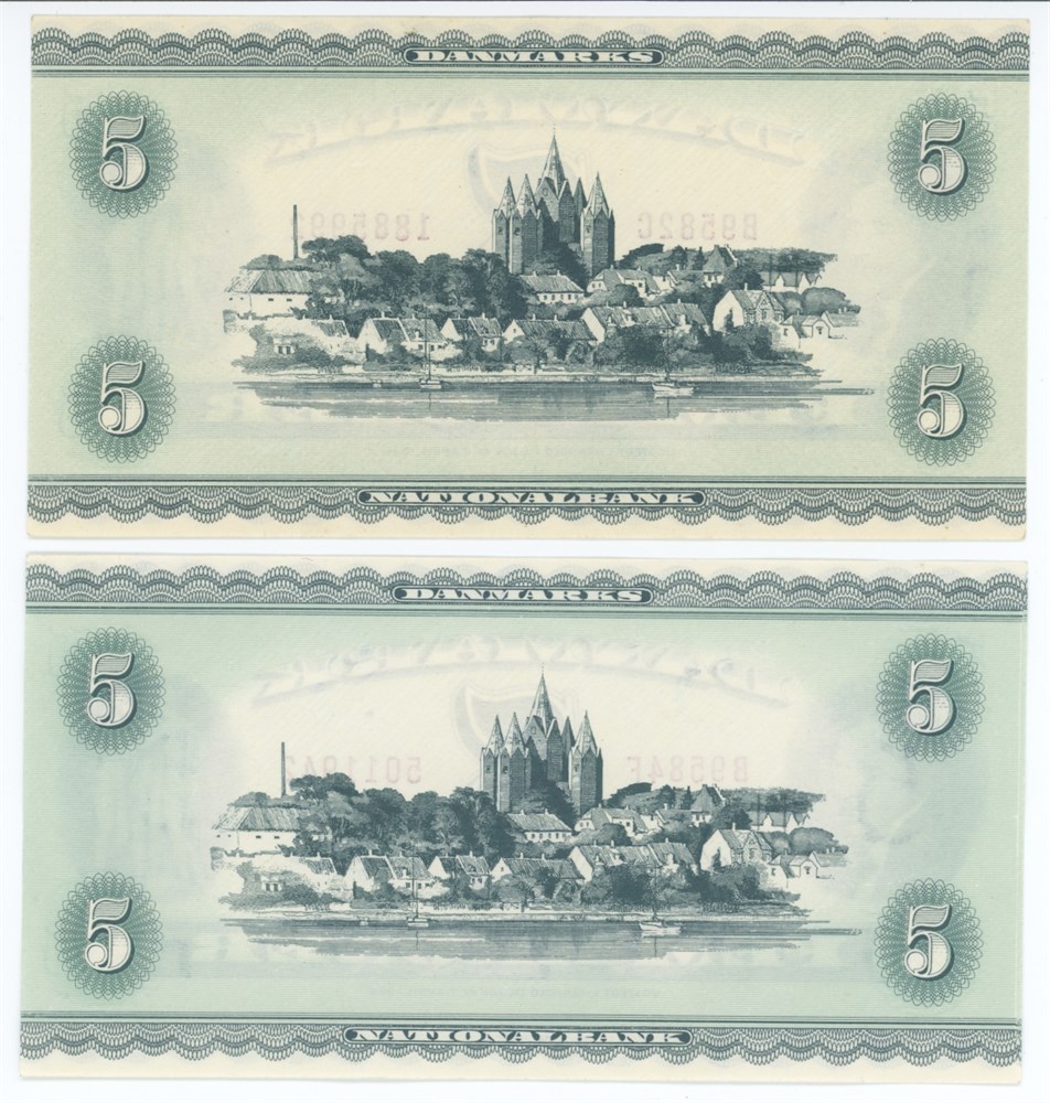 5 kroner 1958 B9, 2 forskellige, fast underskriver Riim. (2)