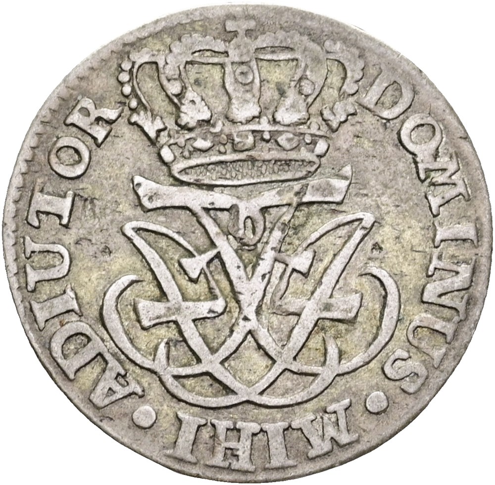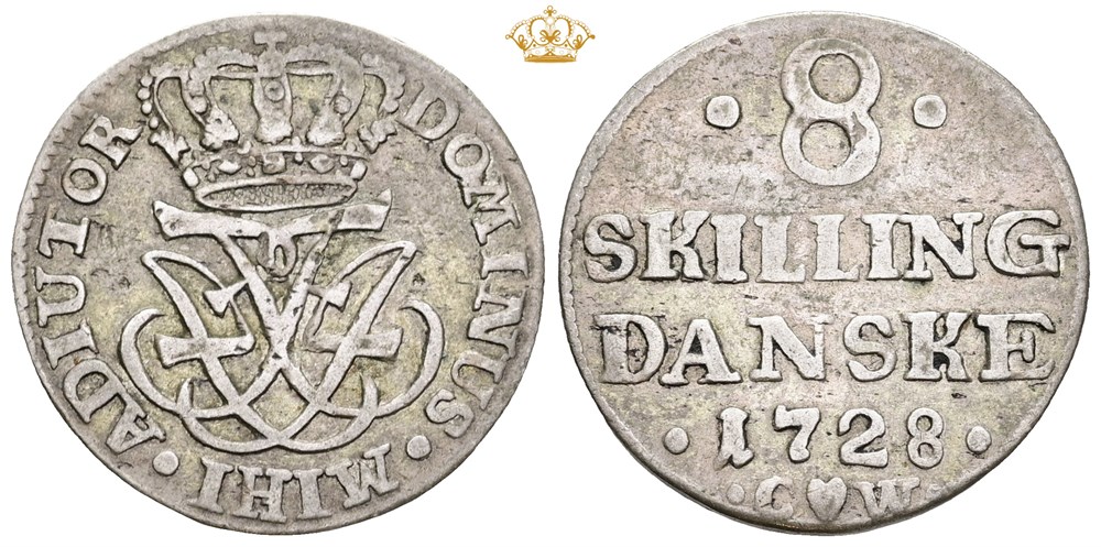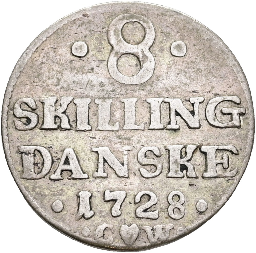8 skilling 1728, etårstalstype med spejlmonogram.