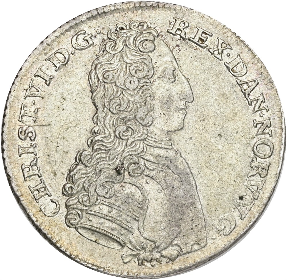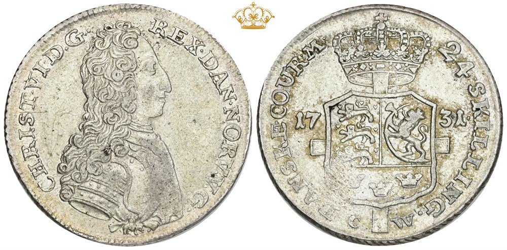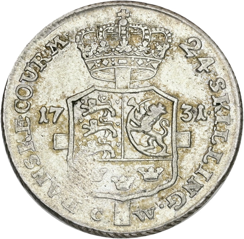24 skilling 1731, ridser - ualmindelig variant hvor Christian Winekes møntmestermærke er reduceret til en prik.