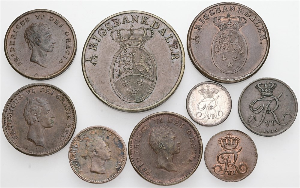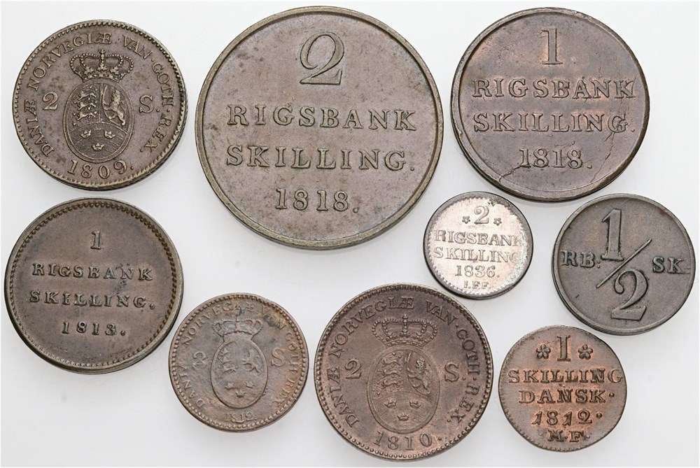 Skilling 1812; 2 skilling 1809, 1810; 3 skilling 1812; 1/2 rigsbankskilling 1838; rigsbankskilling 1813, 1818; 2 rigsbankskilling 1818, 1836. (9)