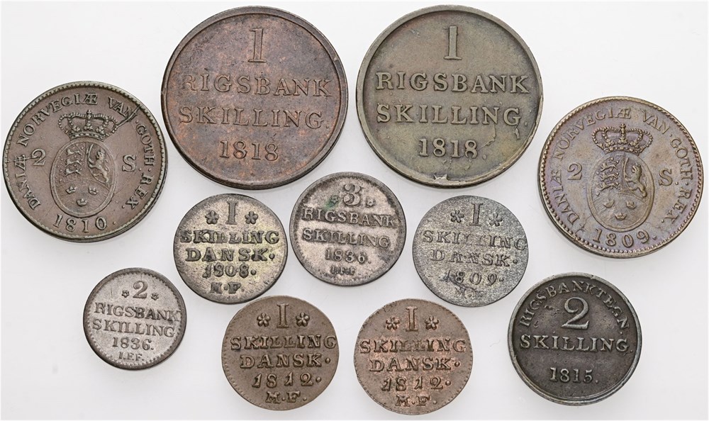 Skilling 1808, 1809, 1812 (2); 2 skilling 1809, 1810; rigsbanktegn for 2 skilling 1815; rigsbankskilling 1818 (2); 2 rigsbankskilling 1836; 3 rigsbankskilling 1836. (11)