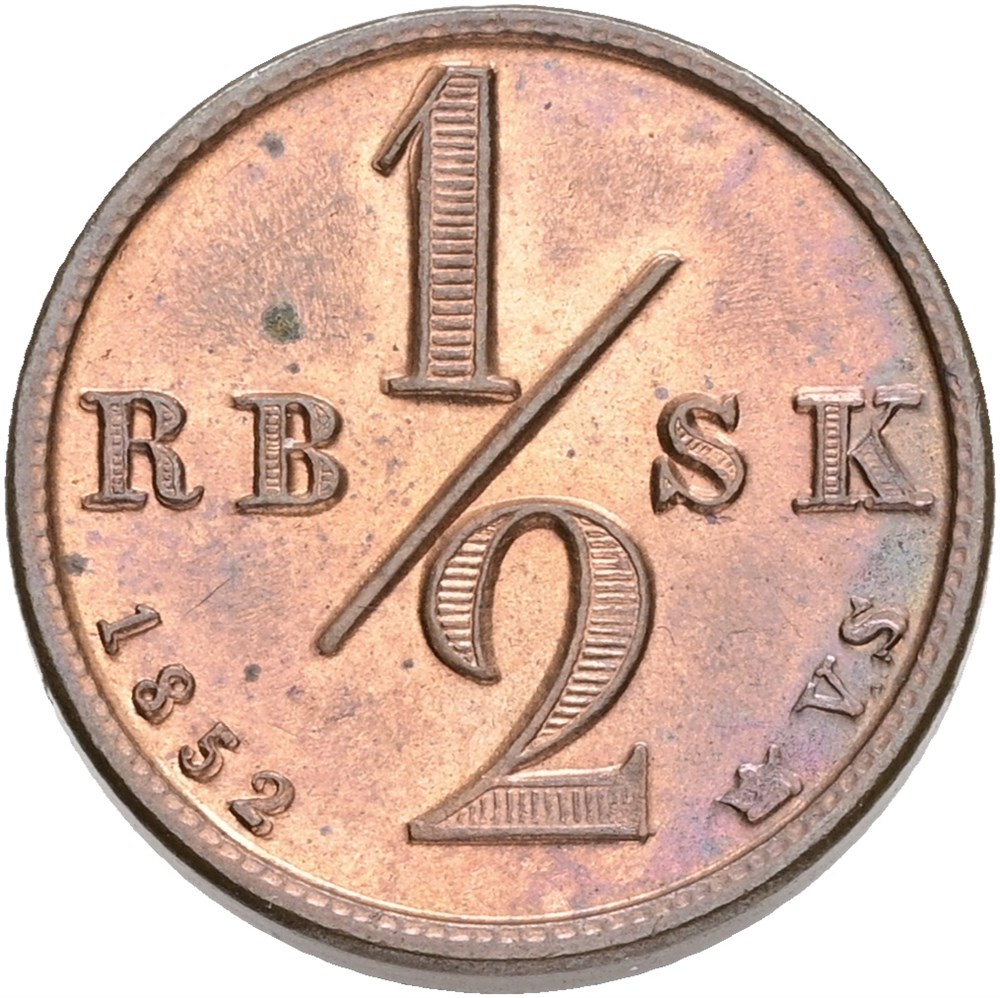1/2 rigsbankskilling 1852, enkelte pletter.