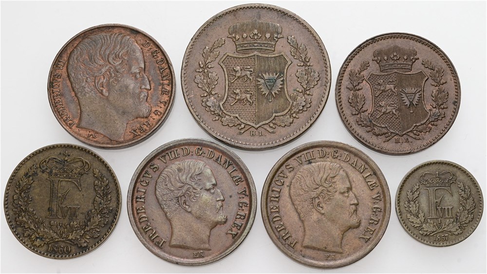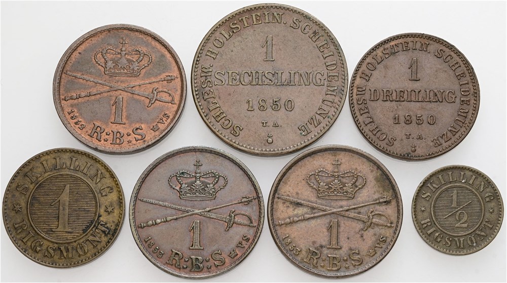 Rigsbankskilling 1852, 1853 (2); 1/2 skilling 1857; skilling 1860; Slesvig-Holsten, Oprørsregeringen, dreiling 1850; sechsling 1850. (7)