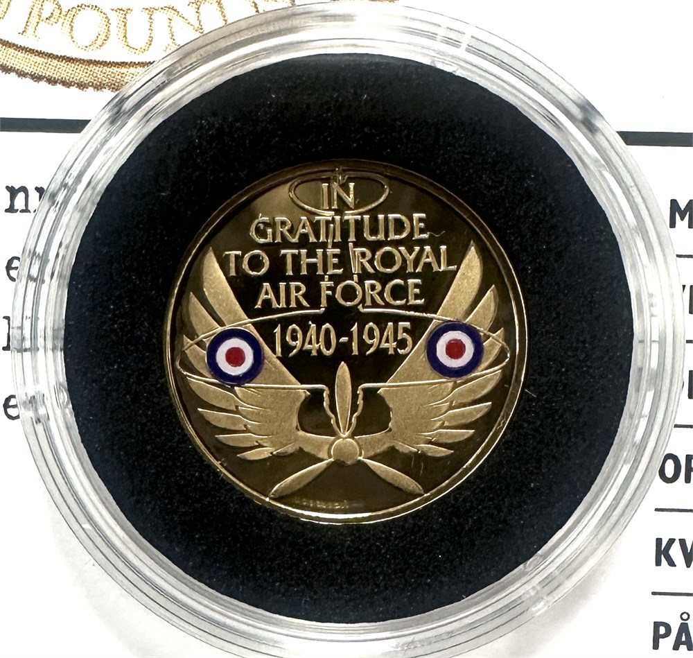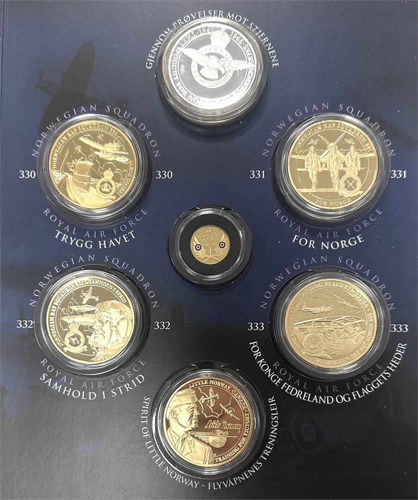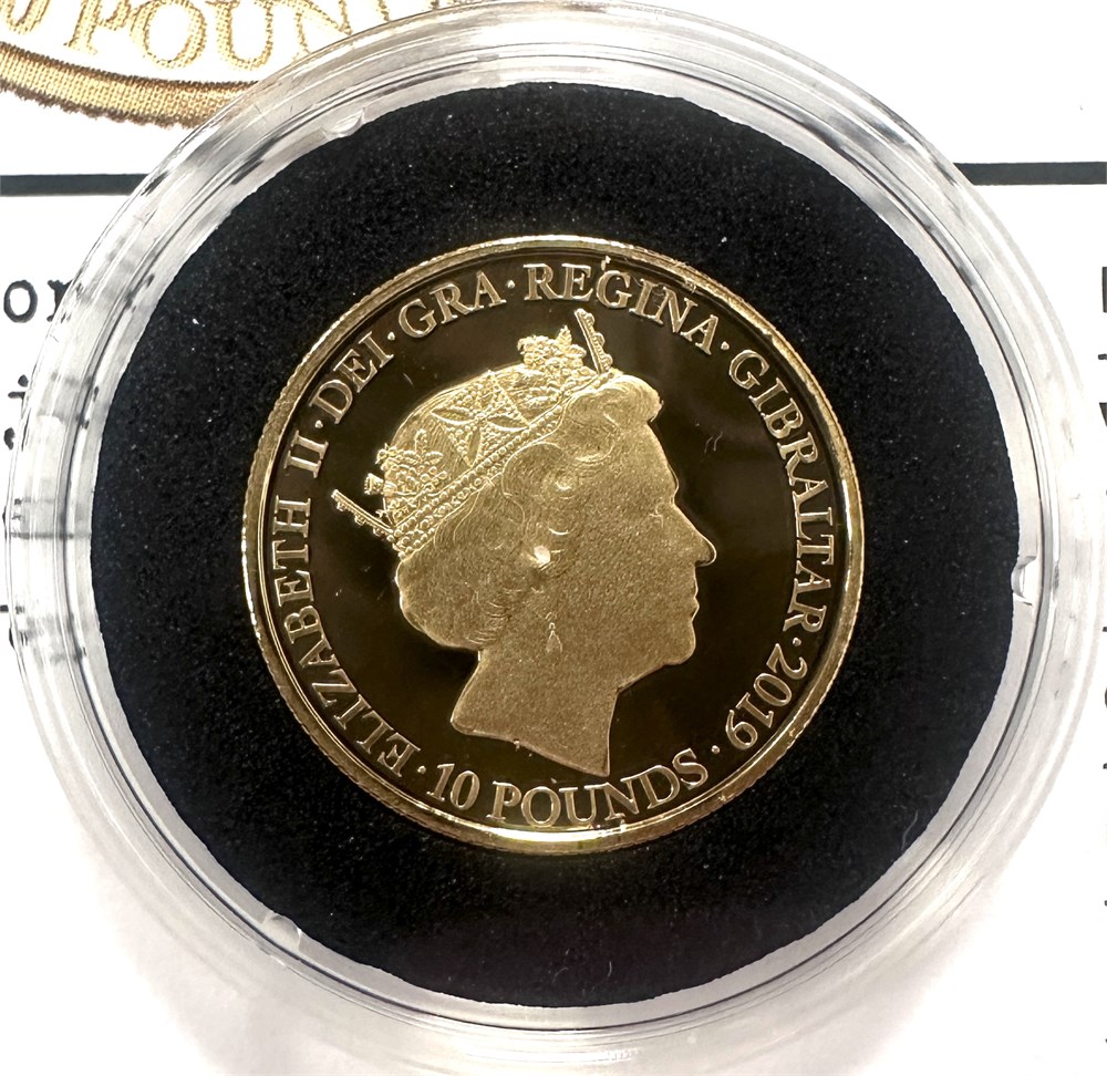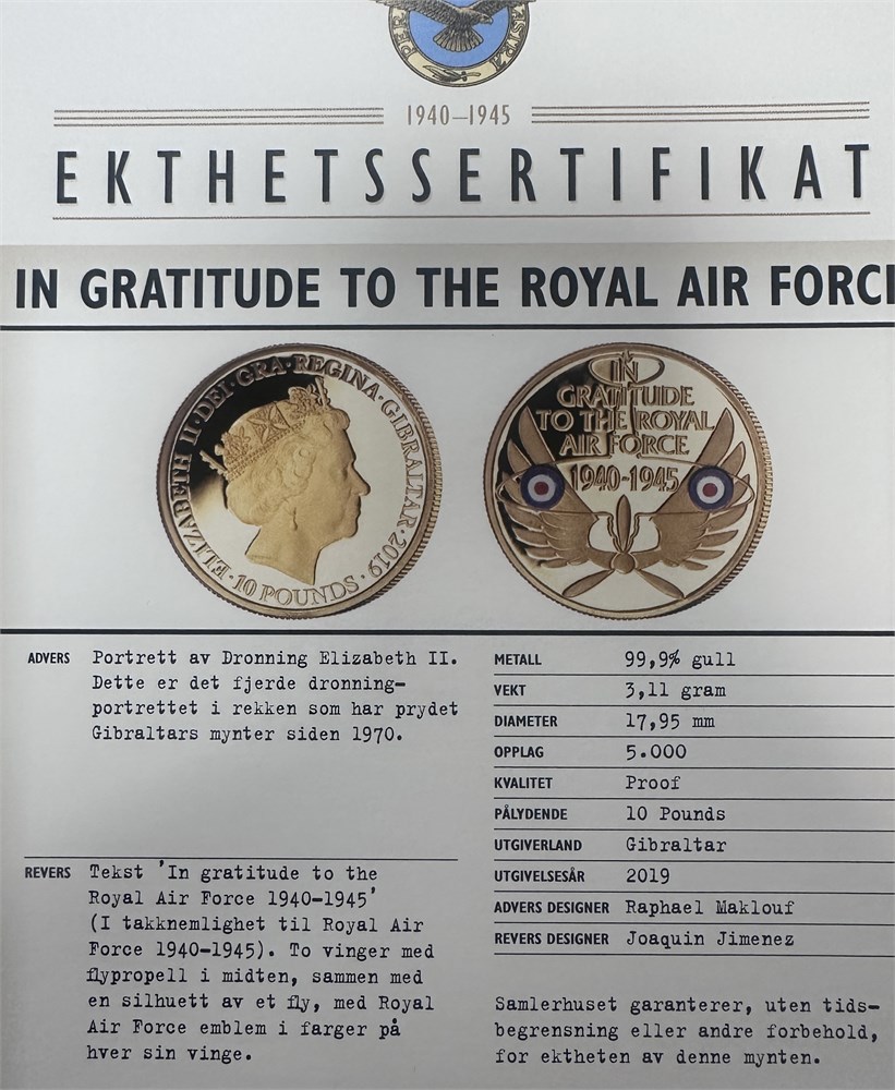 Wings for Norway: Gibraltar, 10 Pounds 2019, Au (999/1000), 3,11 g; Crown 2019 (5); samt medalje, forsølvet Ae. (7)