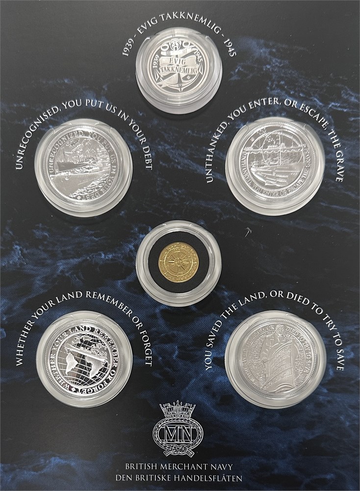 Evig Takknemlig, 1939-1945: Gibraltar, 10 Pounds 2018, Au (999/1000), 3,11 g; 1/2 Crown 2016 (4), Ag (999/1000), 15,55 g; samt medalje, Ag (999/1000), 7,77 g. (6)