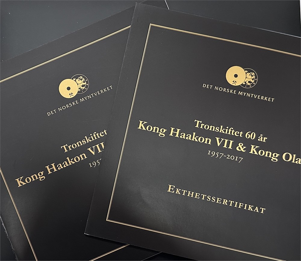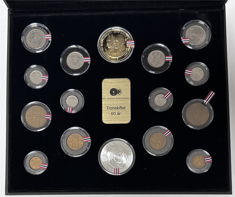 Tronskiftet Kong Haakon VII og Kong Olav V, 60 år, 2017, sæt inkl. 25 kroner 1970; tronskiftemedalje 60 år, forgyldt Ag (999/1000), 20 g. (16)