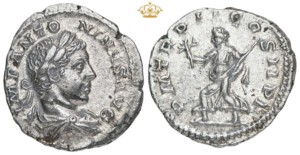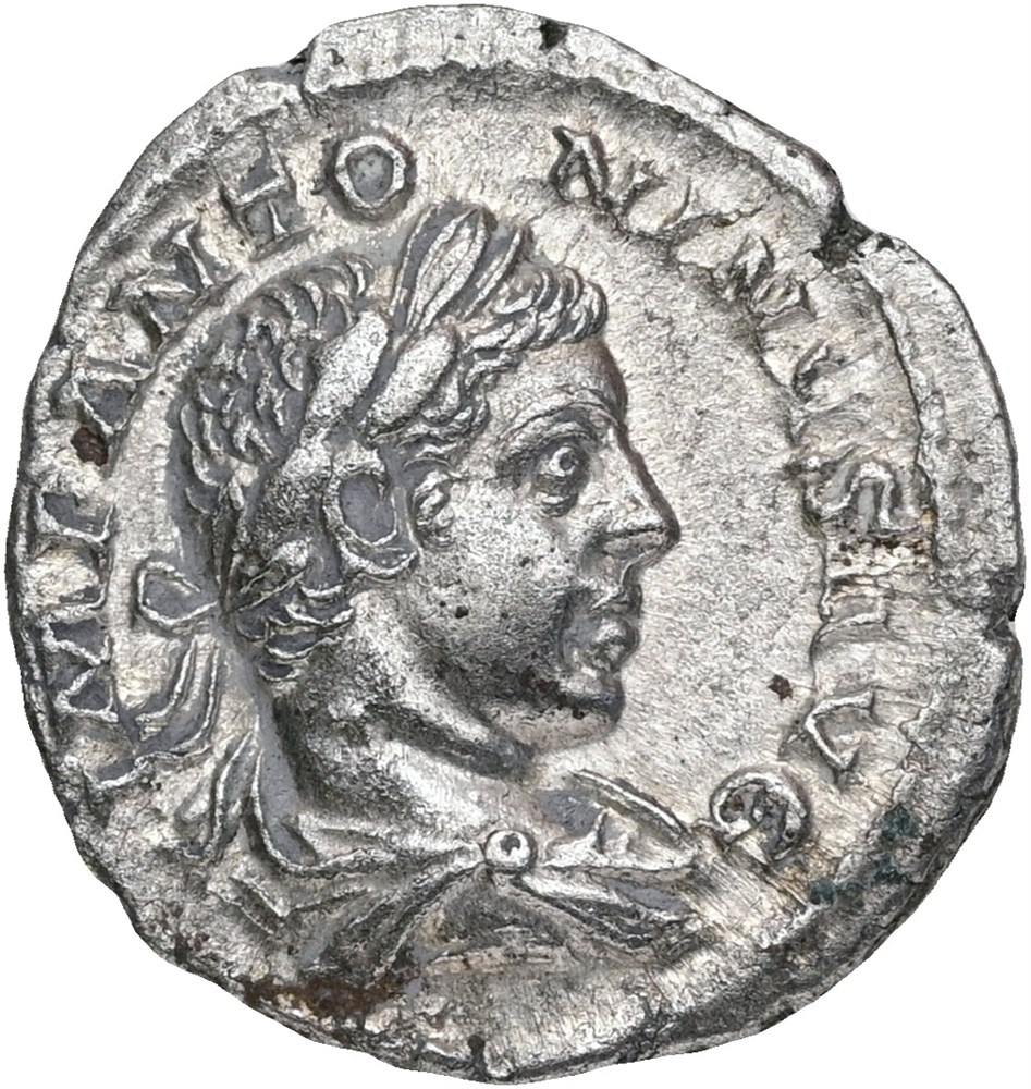 Denarius, 219. IMP ANTONINVS AVG, bust of Elagabalus right. P M TR P II COS II P P, Pax advancing left, branch upward in right hand, transverse scepter in left. Cleaned.