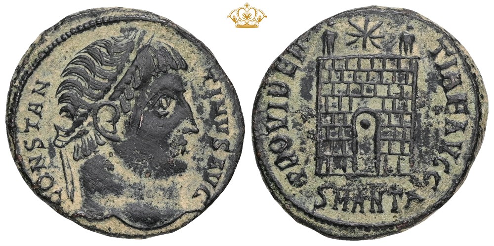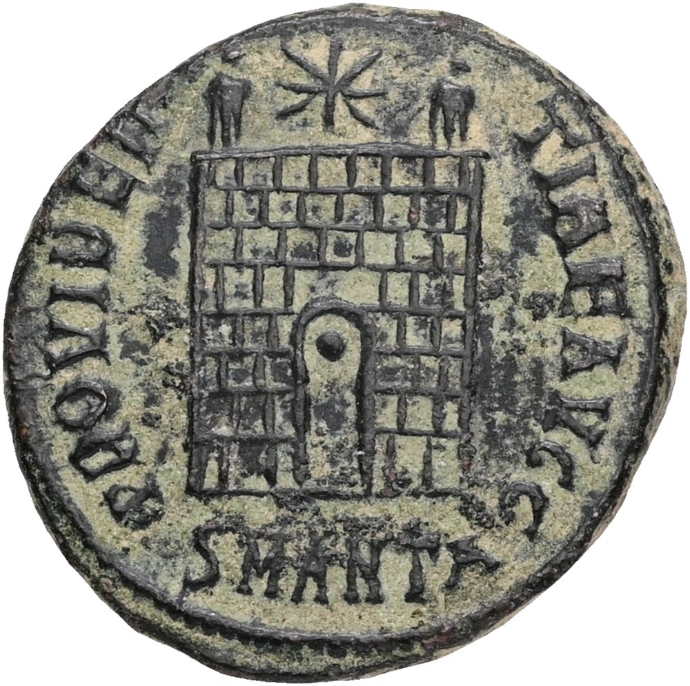 Follis, ca. 325f., Campgate. CONSTANTINVS AVG / PROVIDENTIAE AVGG, camp gate with no doors, two turrets, star above; SMANTA in exergue.