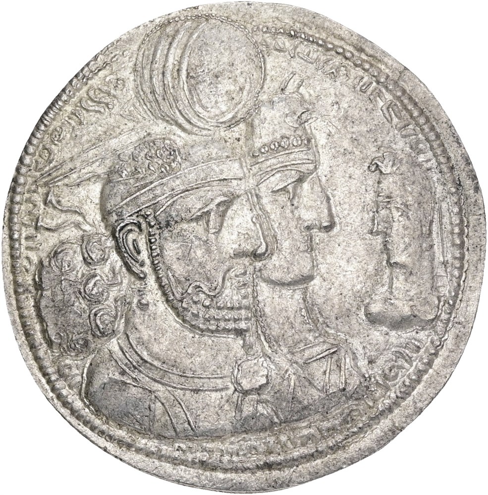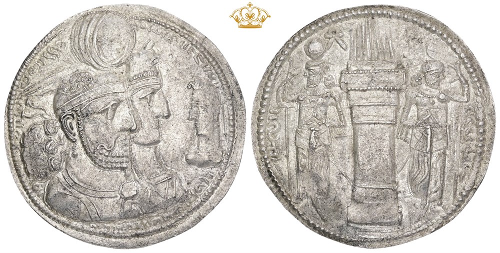 Drachm. King, queen, and prince on obverse. Fire altar between two guardian figures on reverse.