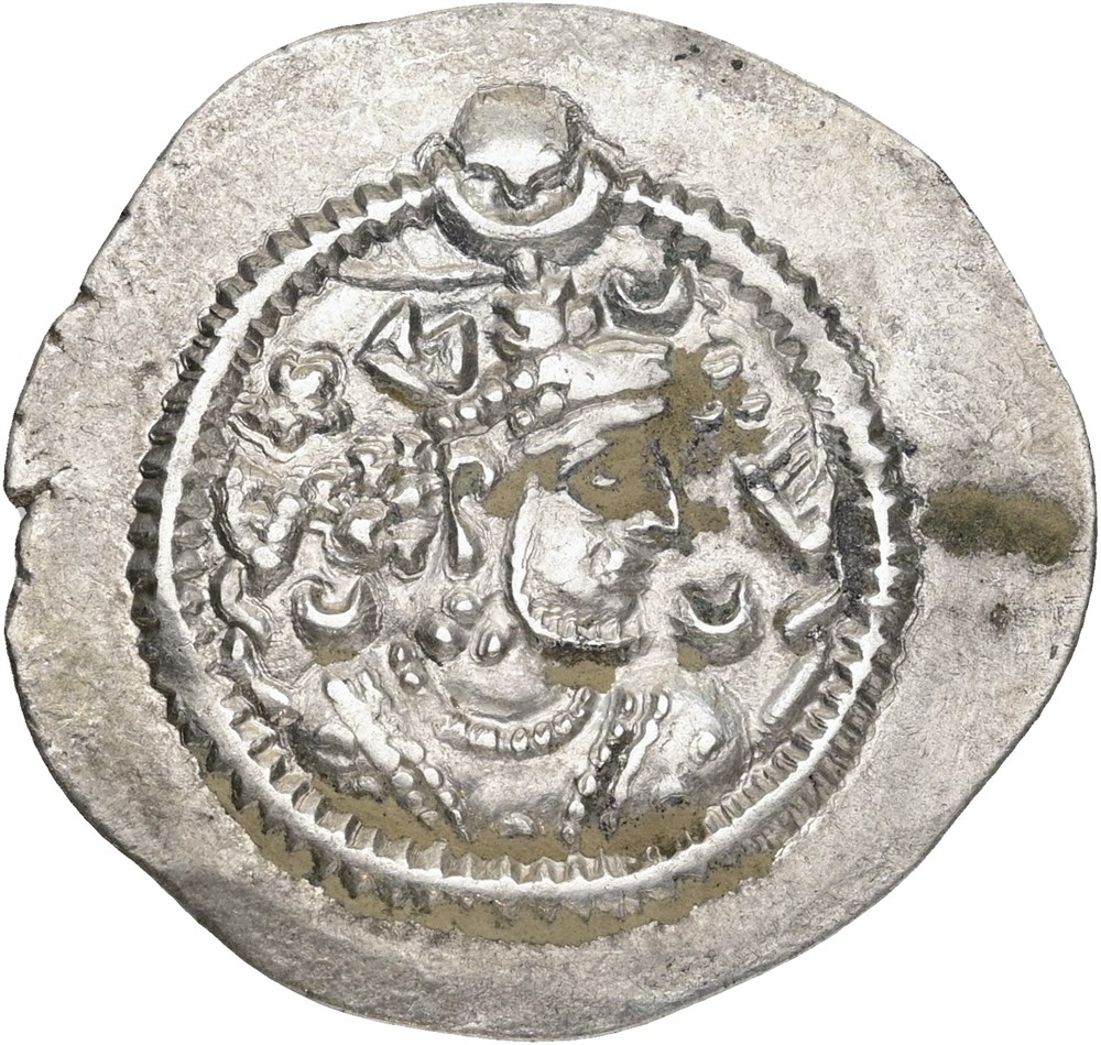 Drachm. Crowned bust right / Fire altar; attendants flanking.