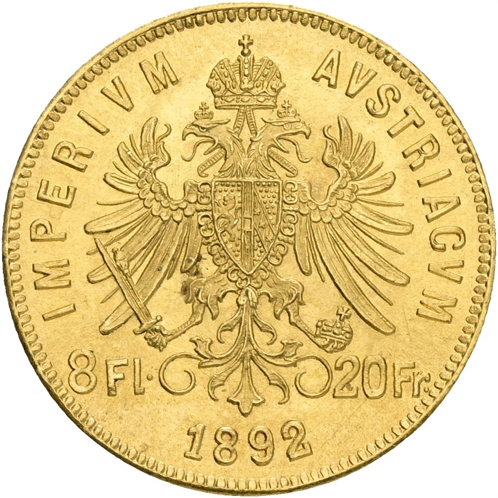 8 Florins / 20 Francs 1892, restrike, Au (900/1000).