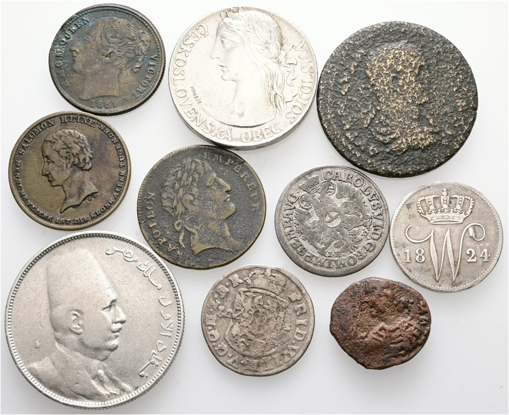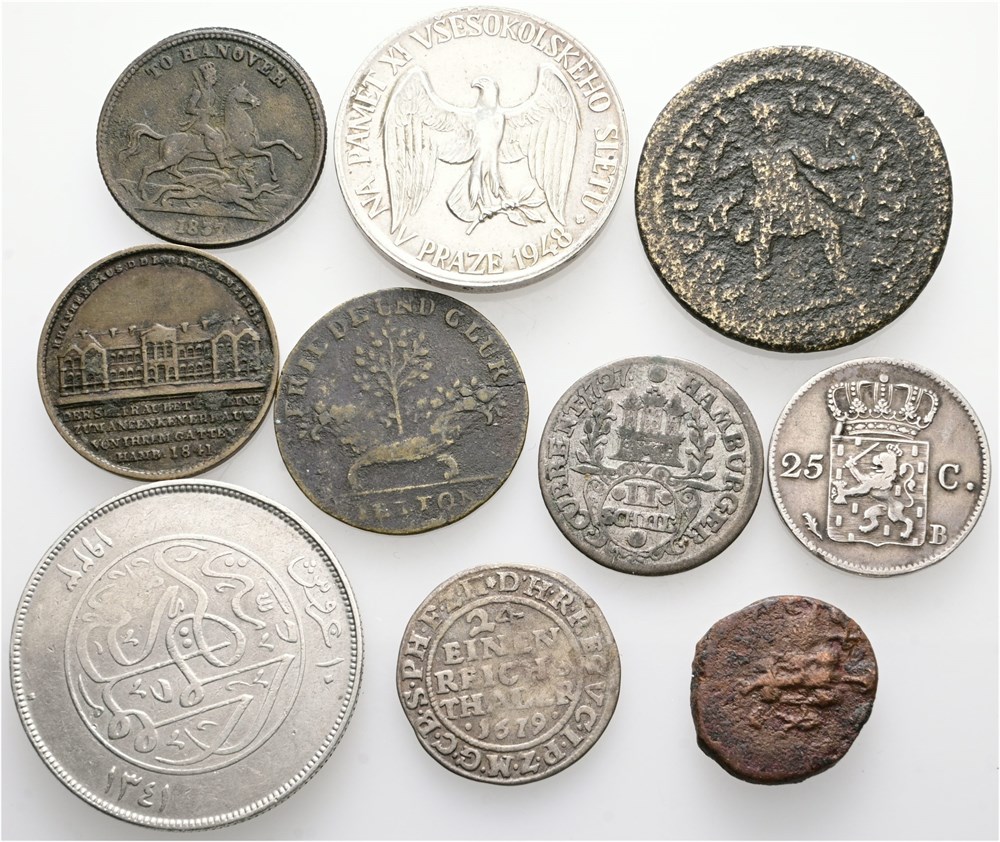 Czechoslovakia, Všesokolský Slet v Praze, 1948, Ag, 13.92 g; Egypt, 10 Qirsh 1923 H; Germany, Brandenburg-Prussia, 1/24 taler 1679, Hamburg, 2 schilling 1727; Netherlands, 25 Cents 1824, traces of mounting. In total 10 pcs.