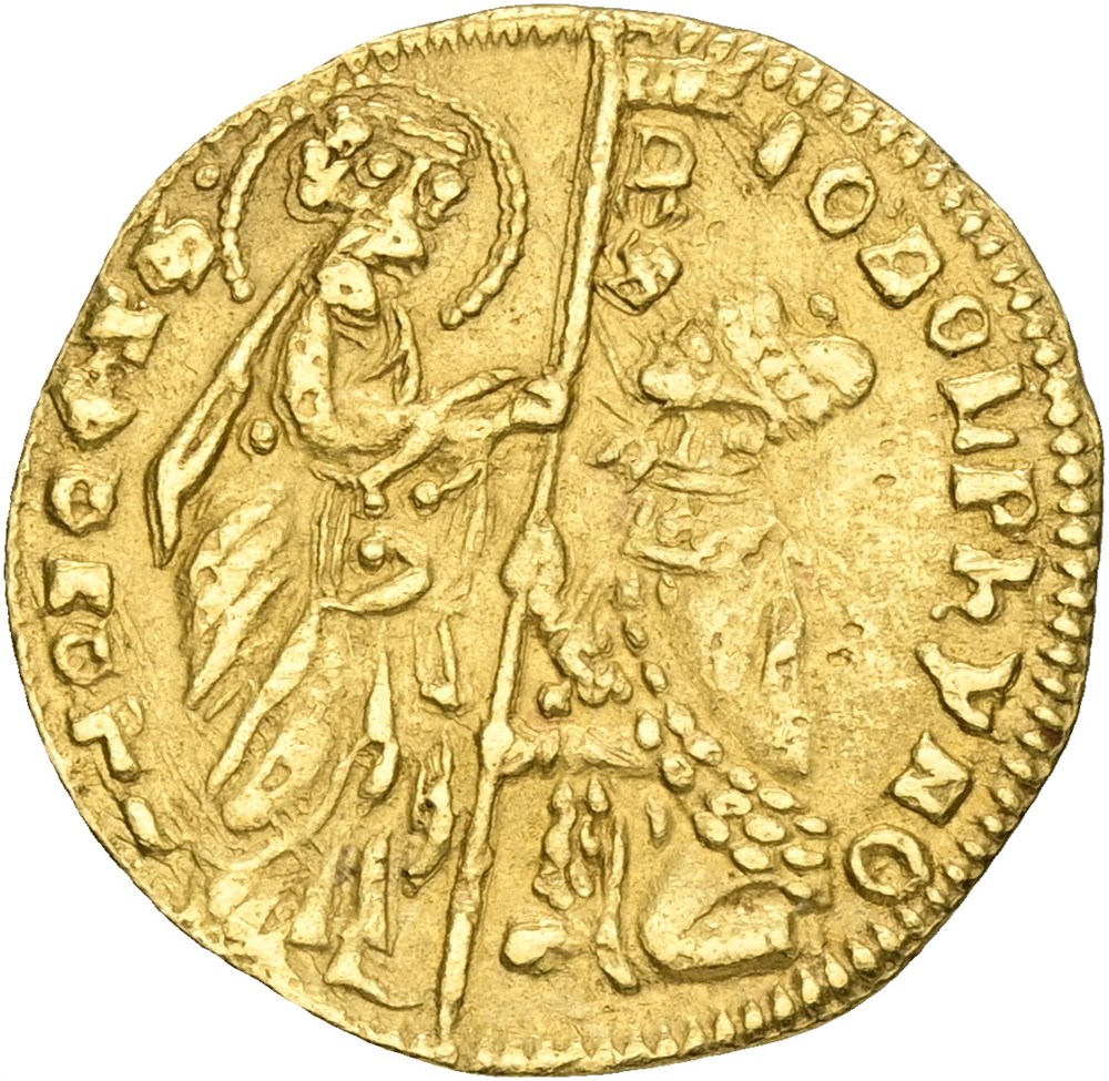 Ducat, Venice, 1356-1361. St. Mark standing right and Doge kneeling left, scepter between them. Christ facing within mandorla containing nine stars.