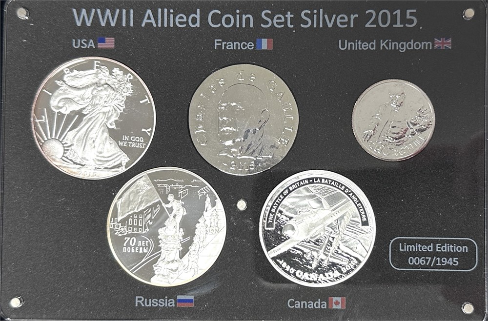 "WWII Allied Coin Set Silver 2015", set with five coins.