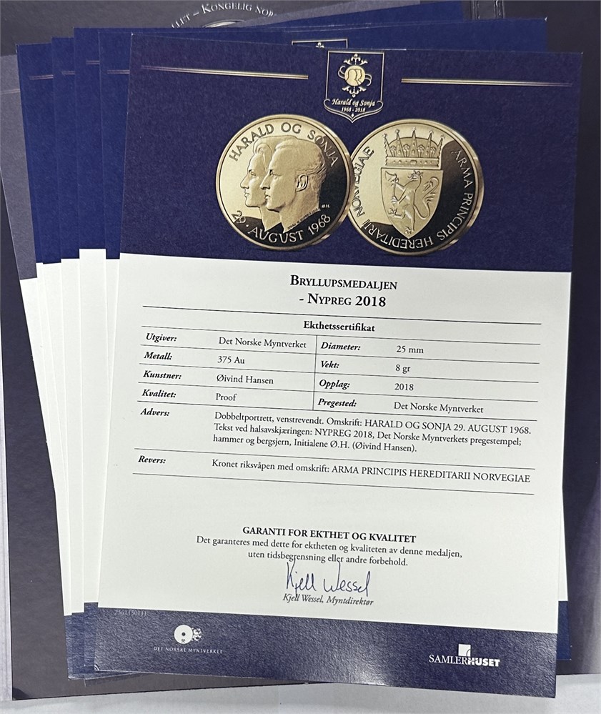 Harald og Sonja, 1968-2018, guldmedalje, 2018, Au (375/1000), 8 g; samt øvrige medaljer (6), forgyldt Ae. (7)