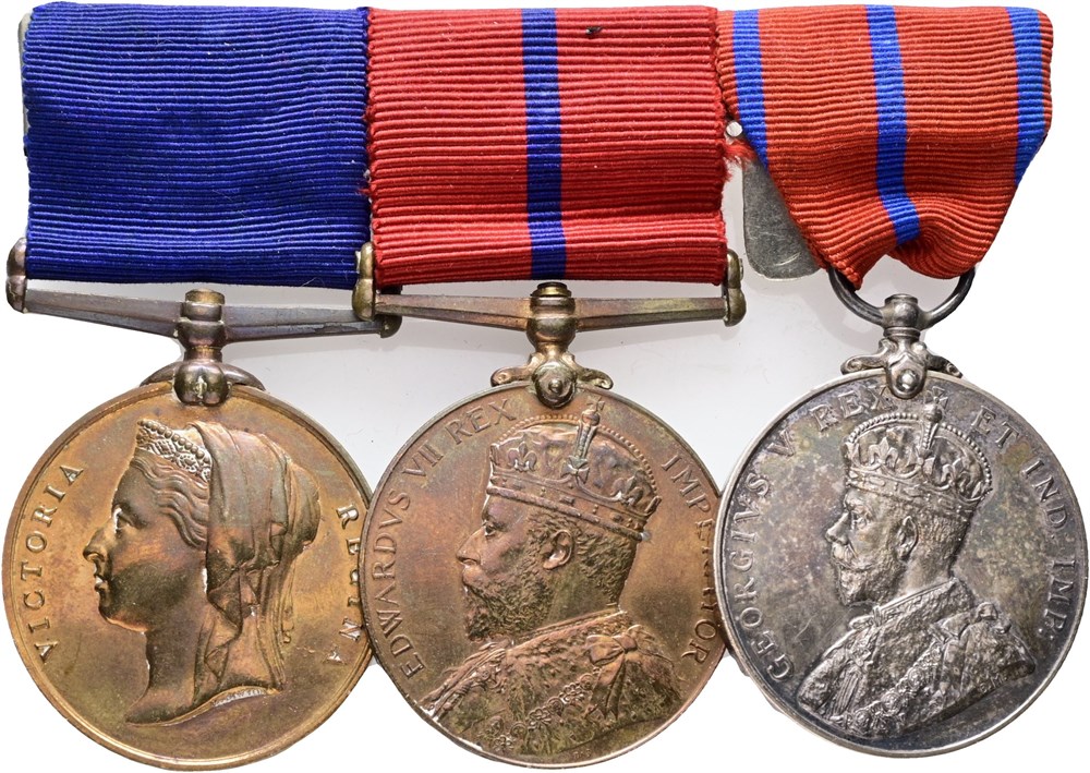 Bar with three Metropolitan Police orders / medals: Queen Victoria Diamond Jubilee 1897, King Edward VII Coronation Medal 1902, and George V Coronation Medal 1911 - all marked "P.C. W. MOODY." and the two first also marked "4th DIV.".