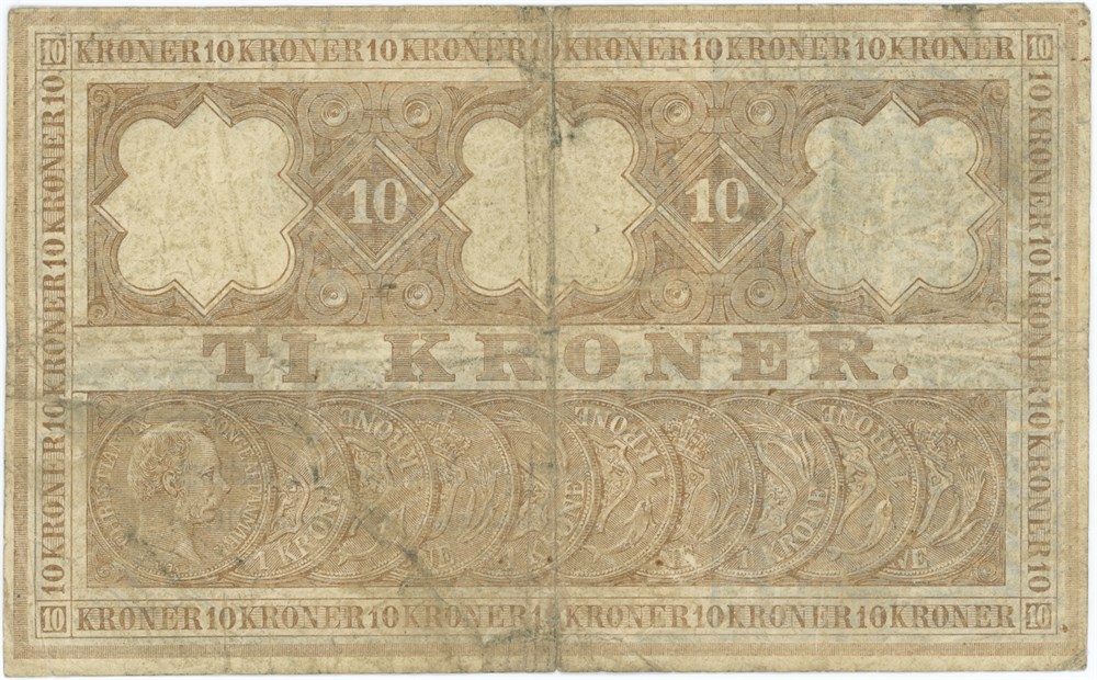 10 kroner 1911 F, nr. 2554910, V. Lange / Klein, 11 mm papirrevne i nedre margin, små huller ved hjørnerne.
