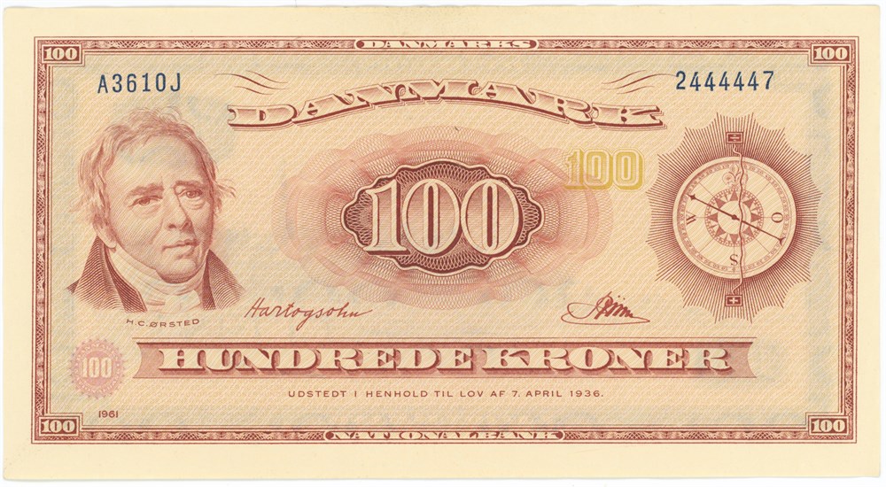 100 kroner 1961 A3, 0J-erstatningsseddel, nr. 2444447, Hartogsohn / Riim.