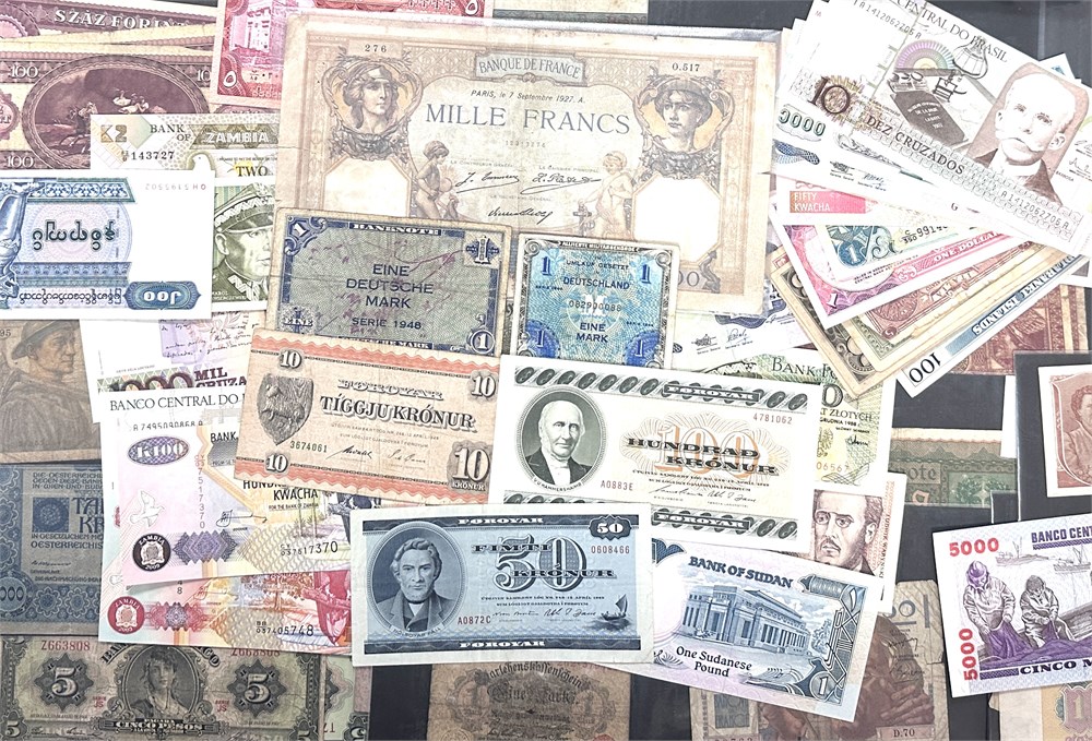 'World', collection paper money incl. Faroe Islands, 50 krónur 1987 A0, 100 krónur 1988 A0; France, 1000 Francs 1927 A; Austria, Brazil, Estonia, Germany, Peru, Philippines, Poland, Trinidad and Tobago, Uruguay, and Zambia. In total c. 70 pcs.