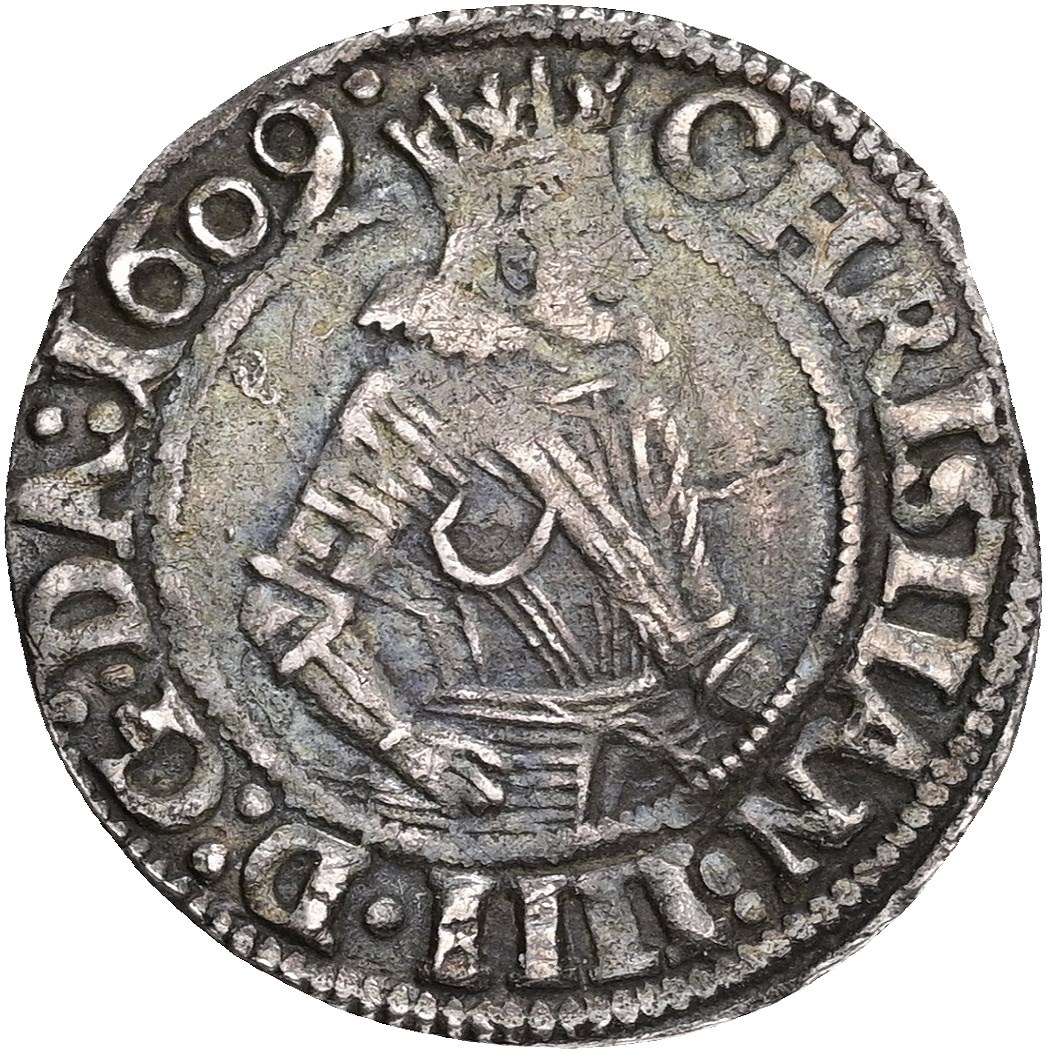 4 skilling 1609, let fladpræg, let buklet.
