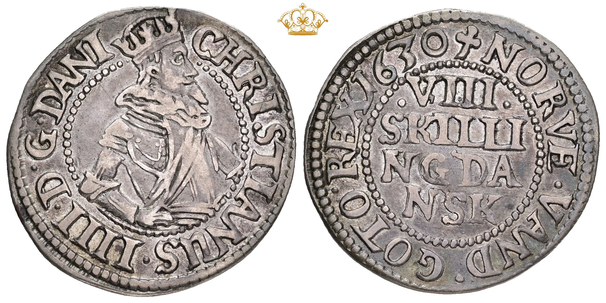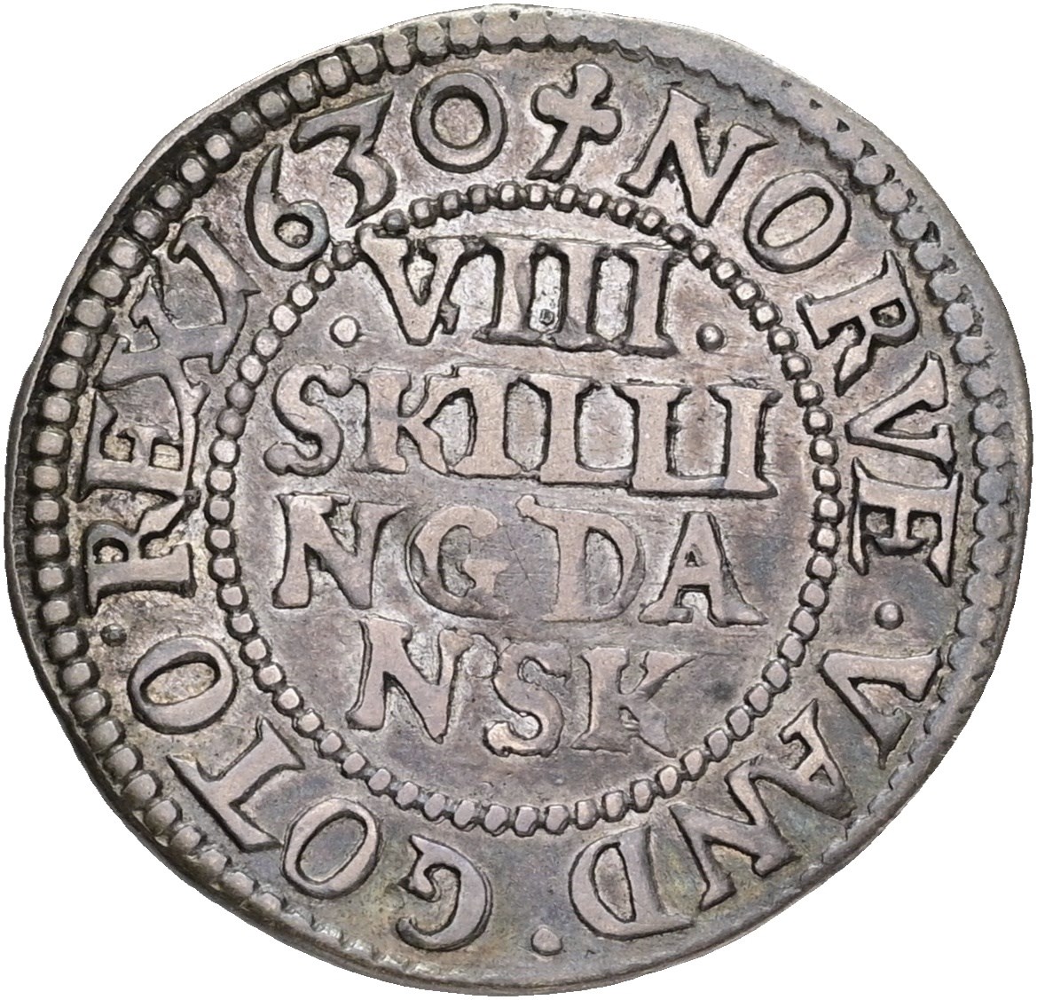8 skilling 1630, nydeligt eksemplar med meget bevaret møntskær, eksemplaret er afbilledet i Siegs møntkatalog.