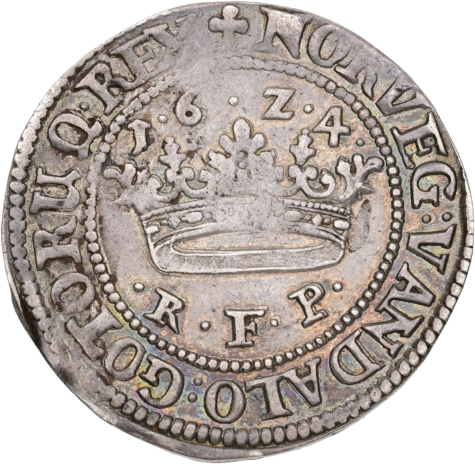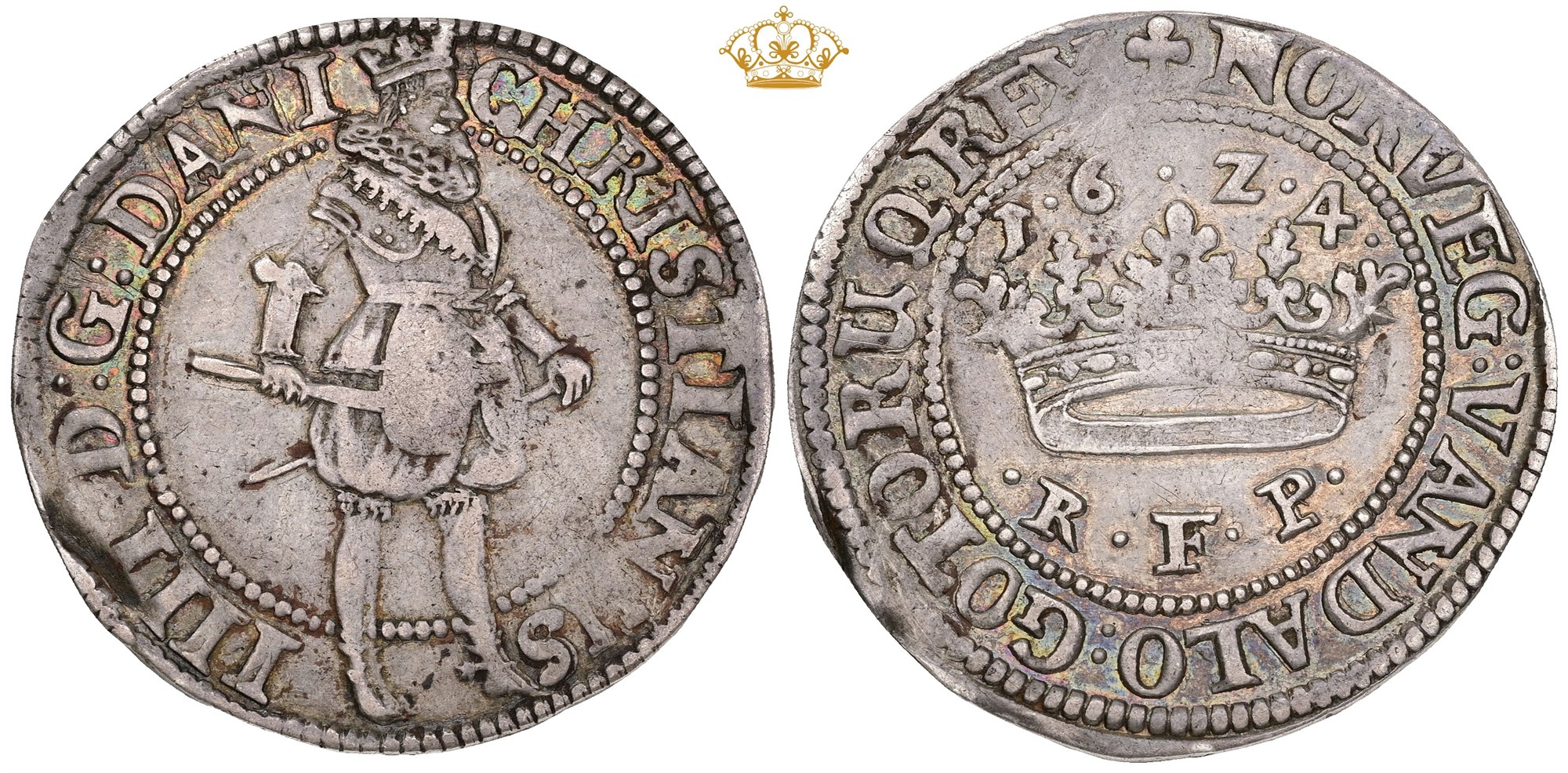 1/2 krone 1624, attraktivt og nydeligt tonet eksemplar af denne sjældne halvkrone.