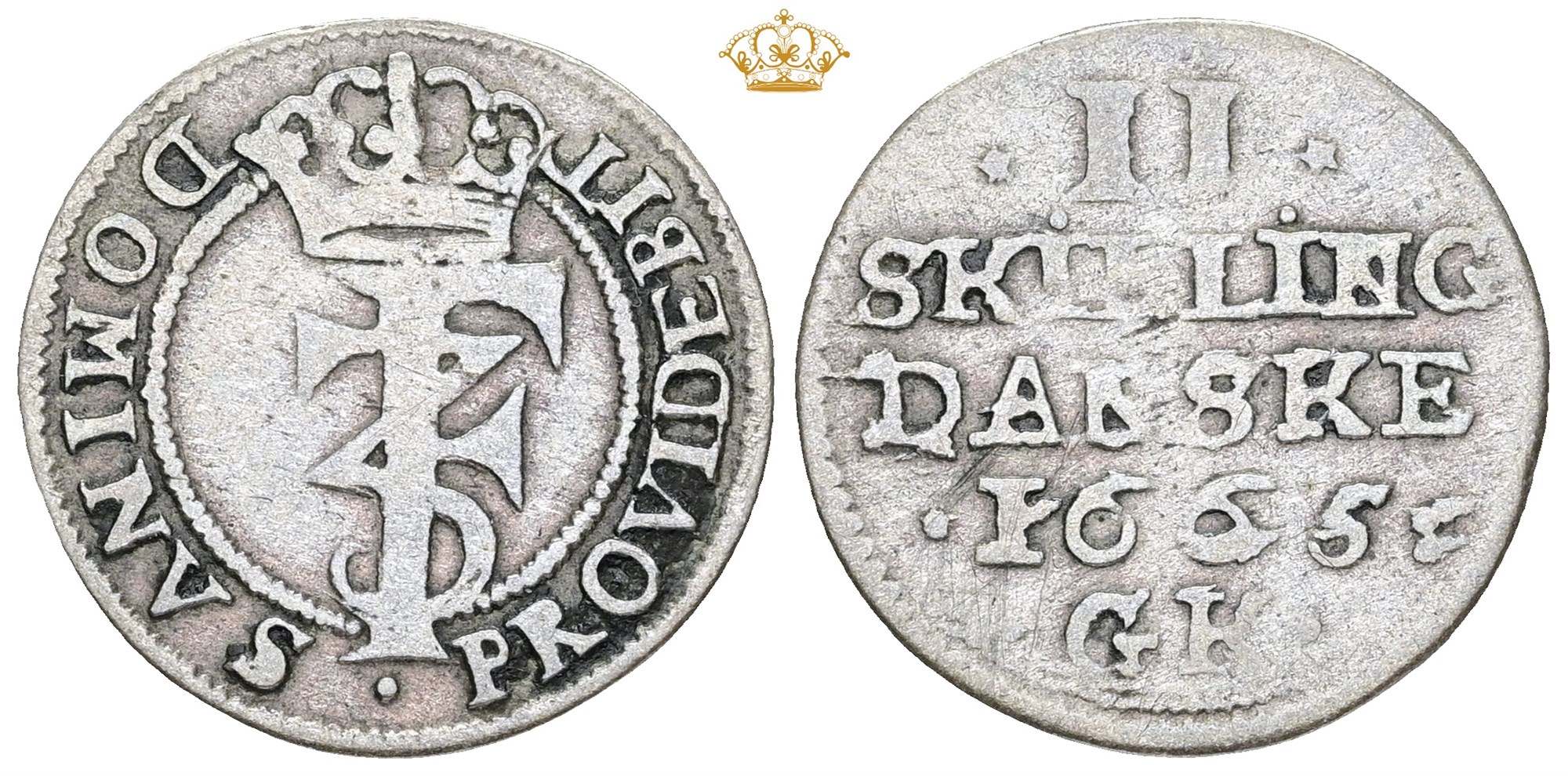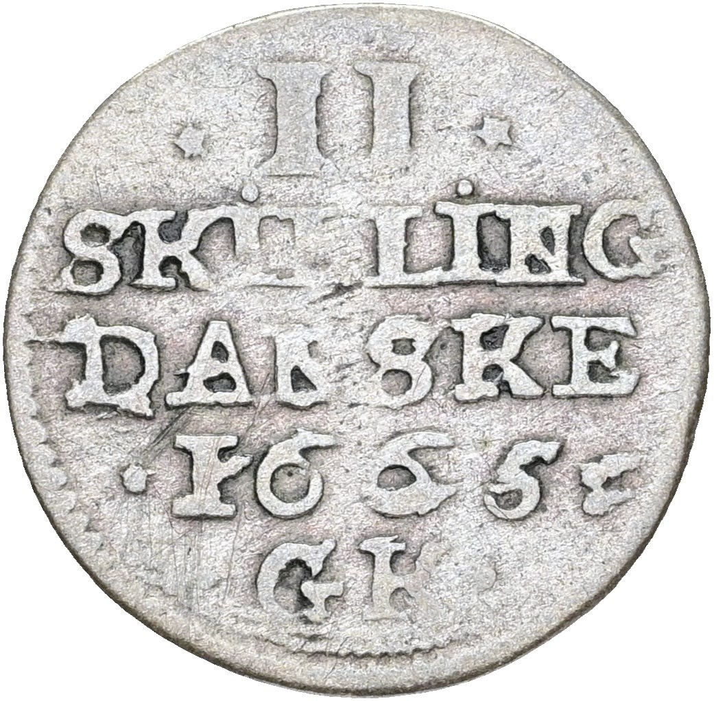 2 skilling 1665, rettet stavefejl N/S.