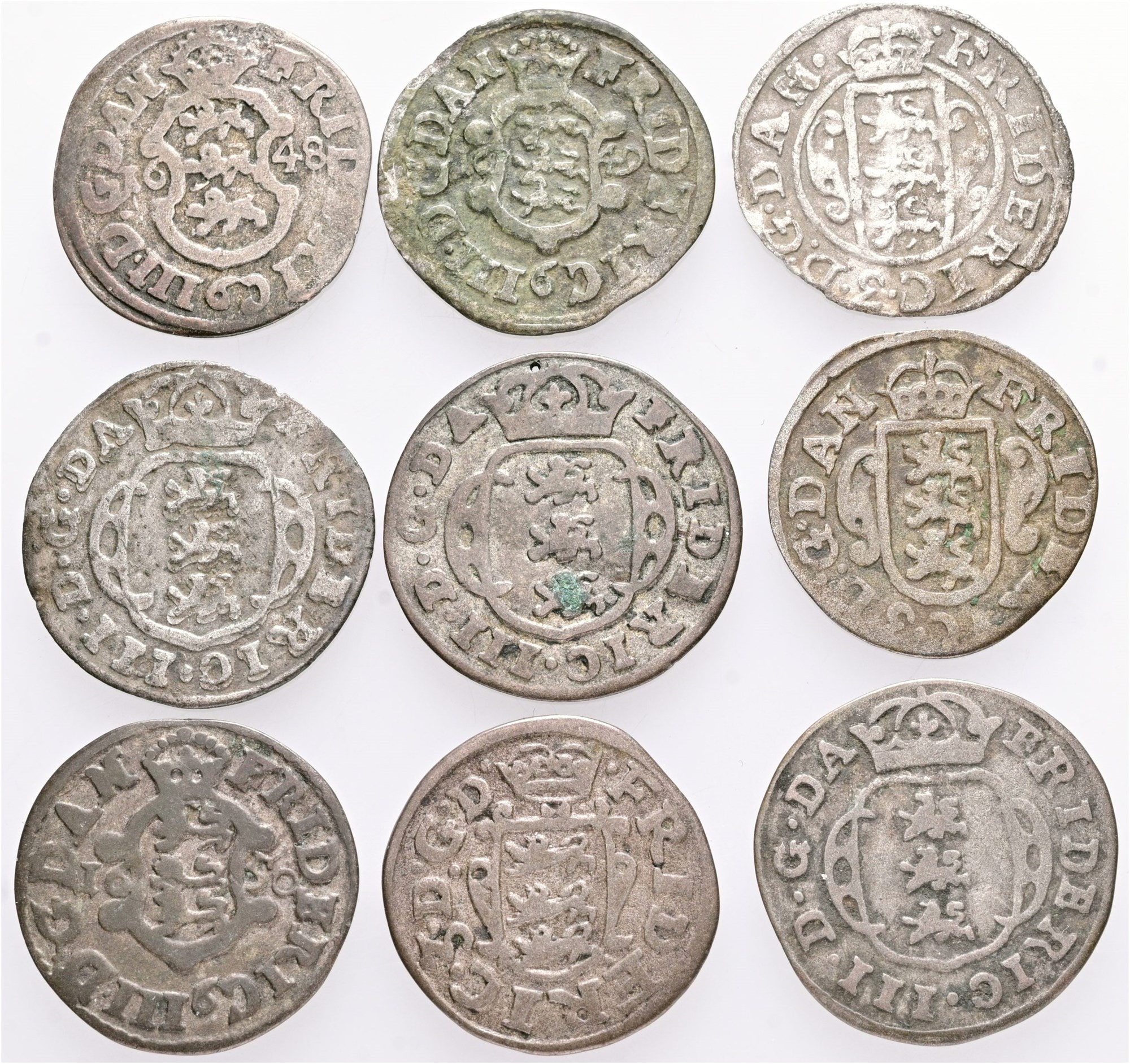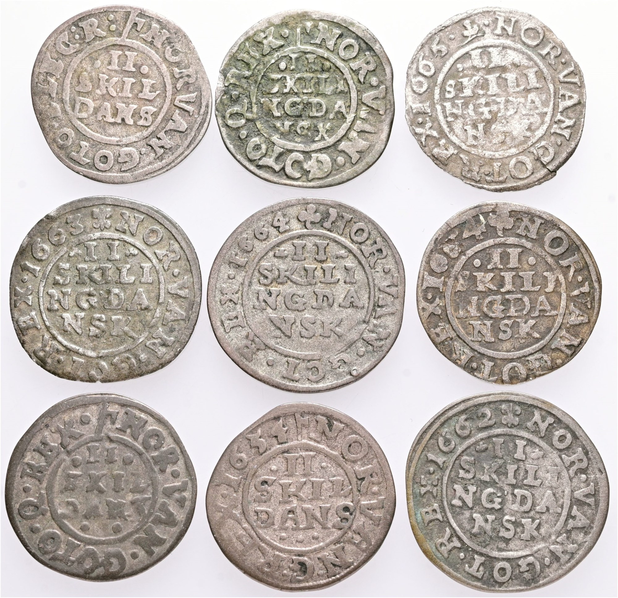 2 skilling 1648, 1649, 1650, 1654, 1662, 1663, 1664 (2), 1665. (9)