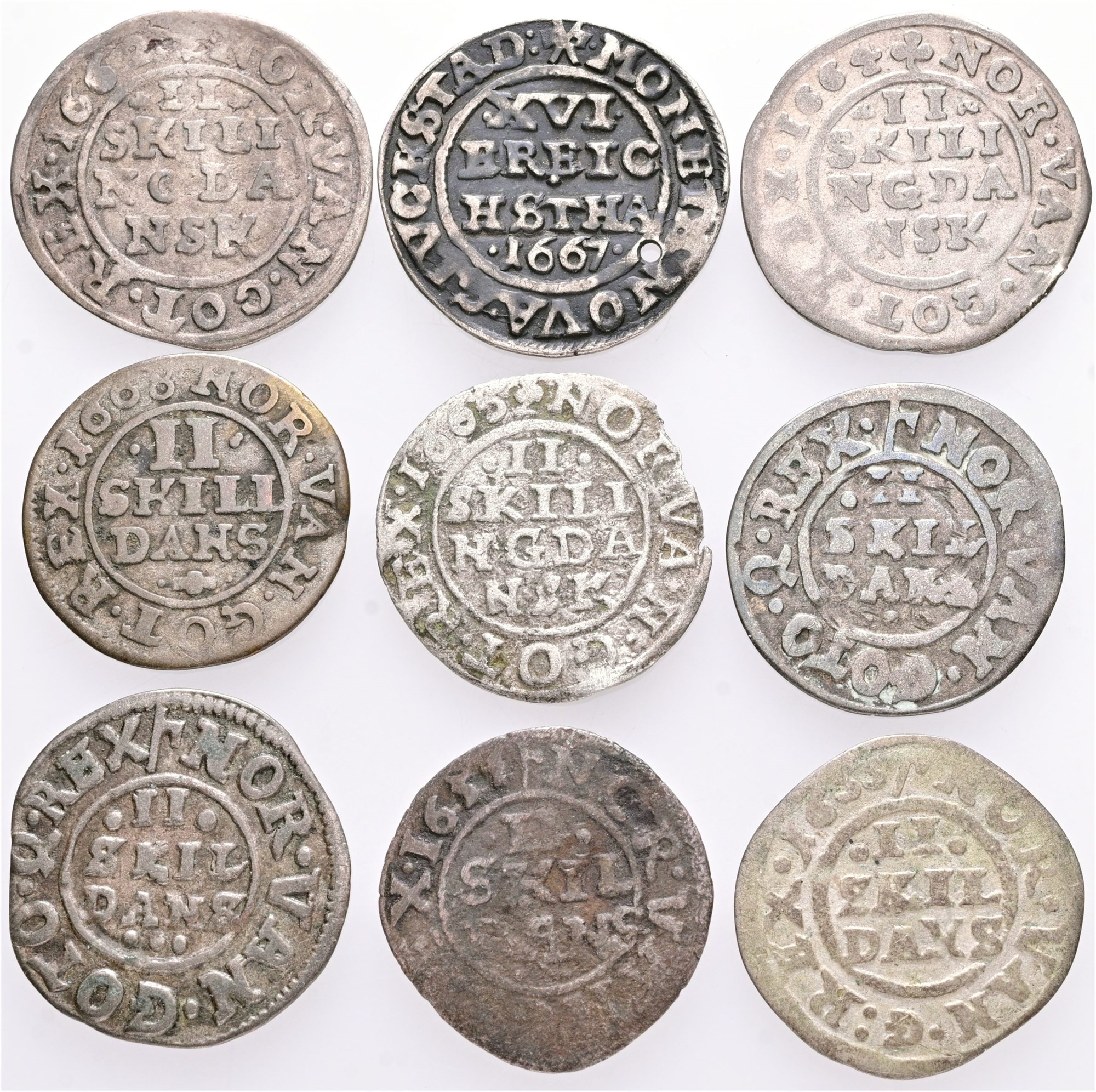 2 skilling, forskellige, samt 3 skilling lybsk 1667. (9)