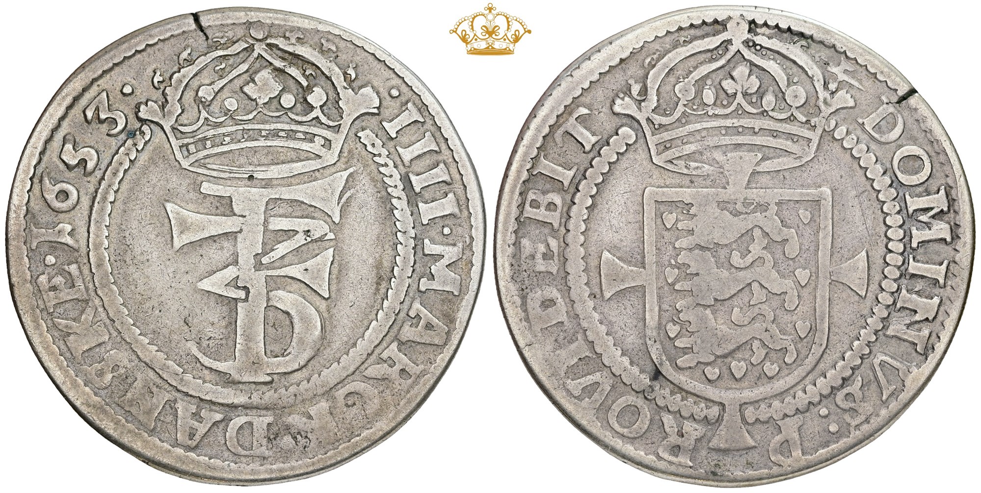 4 mark / krone 1653, forsiden ukendt i Aagaard, lille blanketrevne.