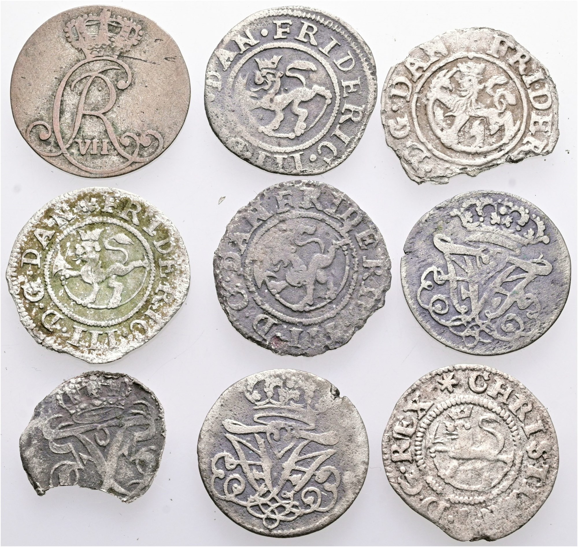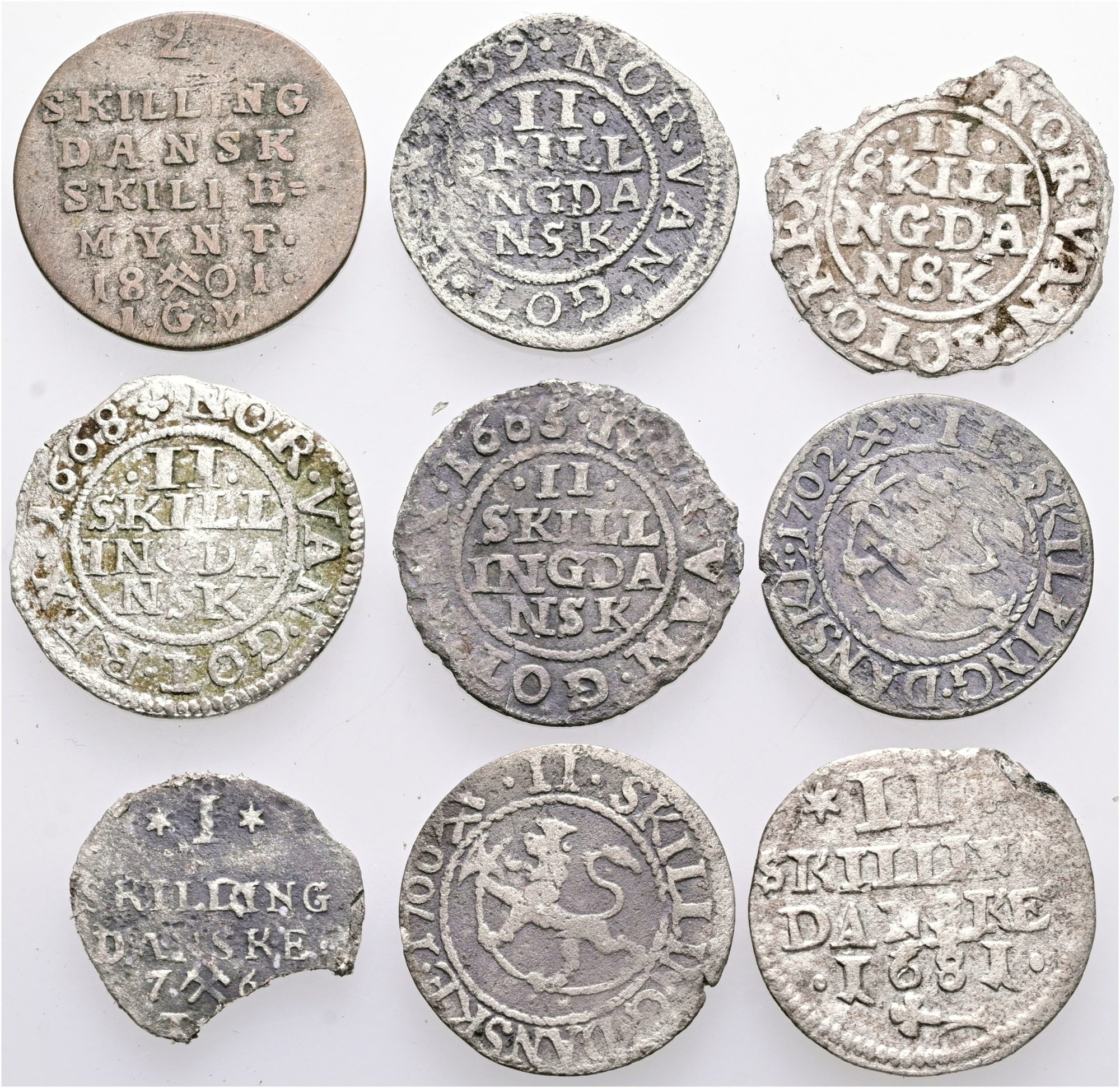 Samling inkl. 2 skilling 1665, 1668, 1669, 1681, 1700, 1702, 1801. I alt 9 stk.