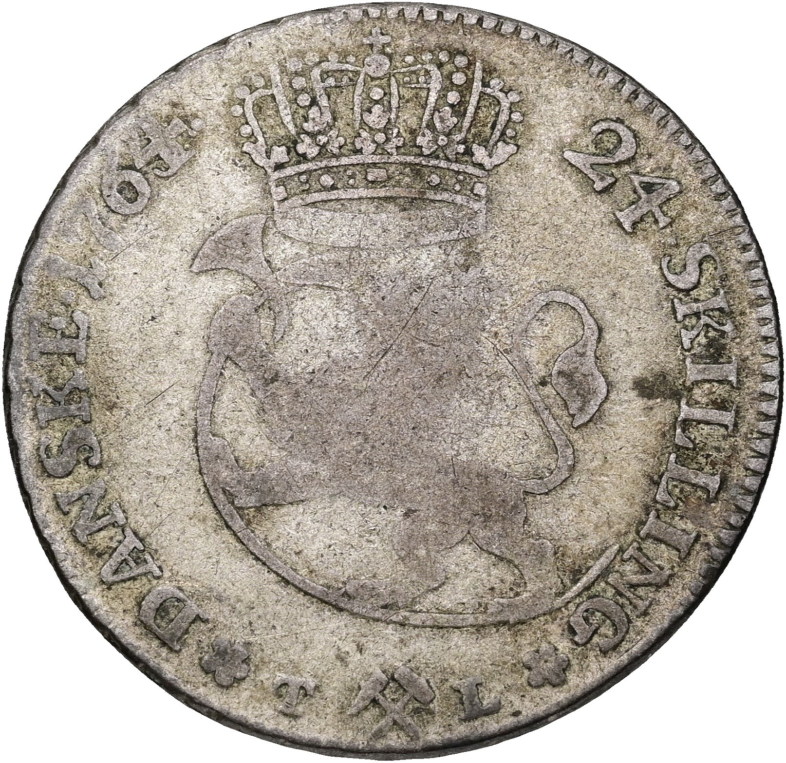 24 skilling 1764, årstal rettet 1764/3, delvist svagt præget.