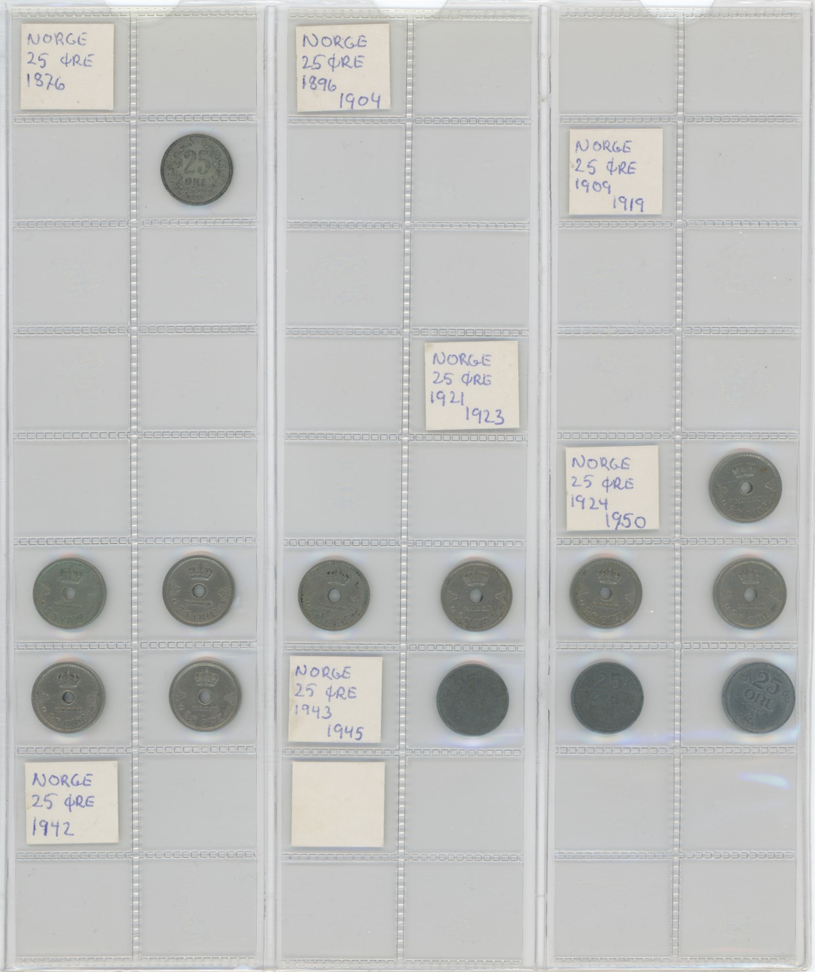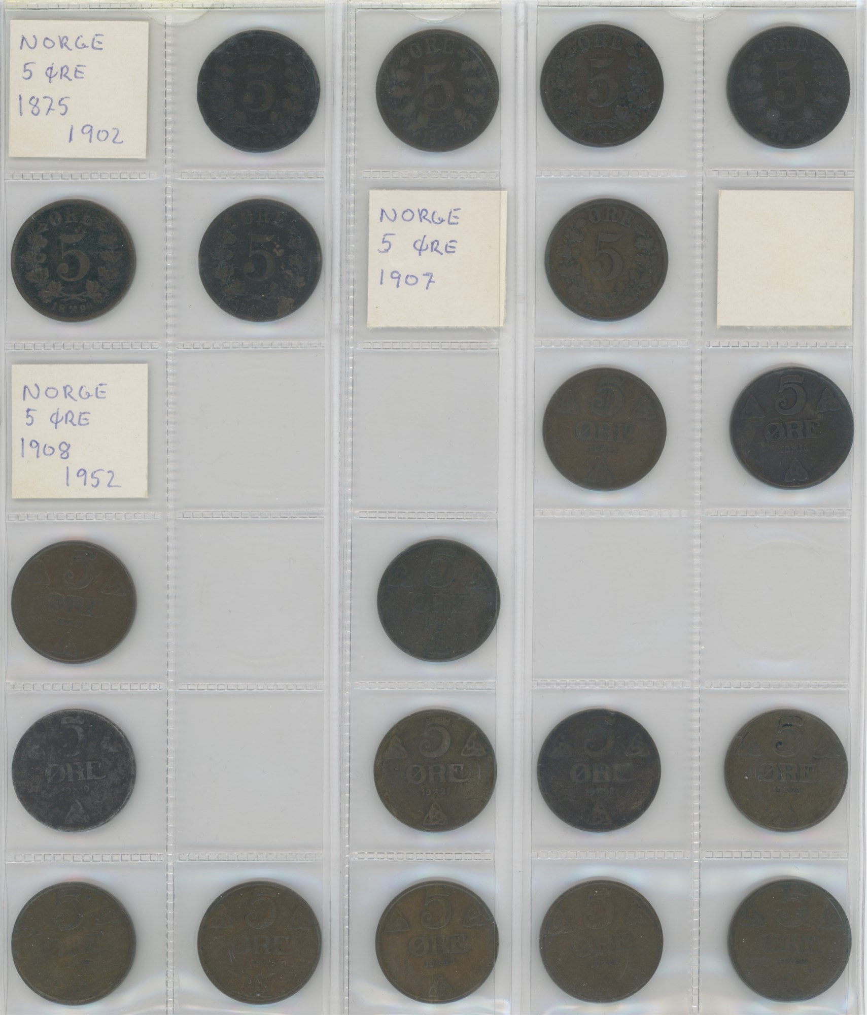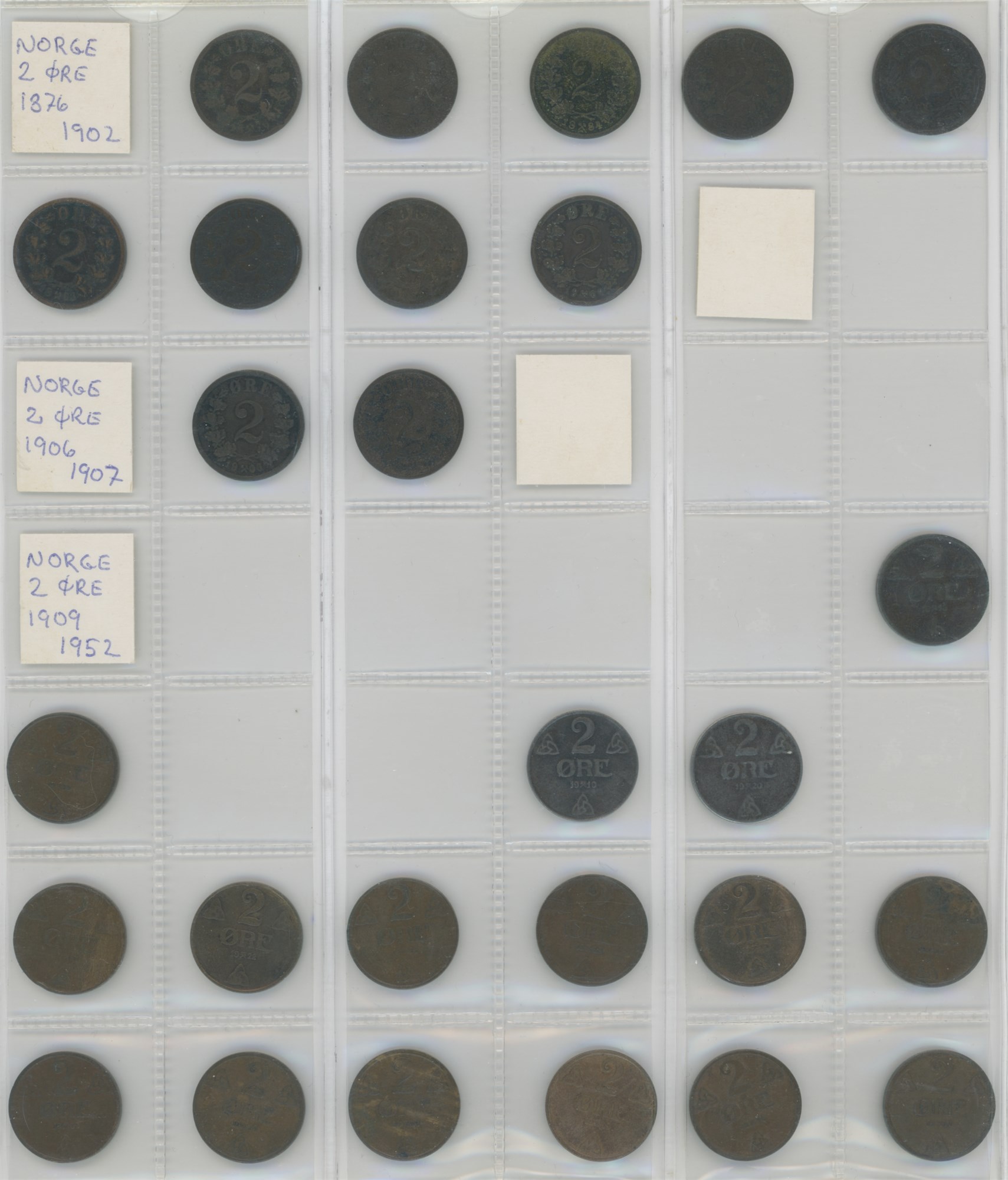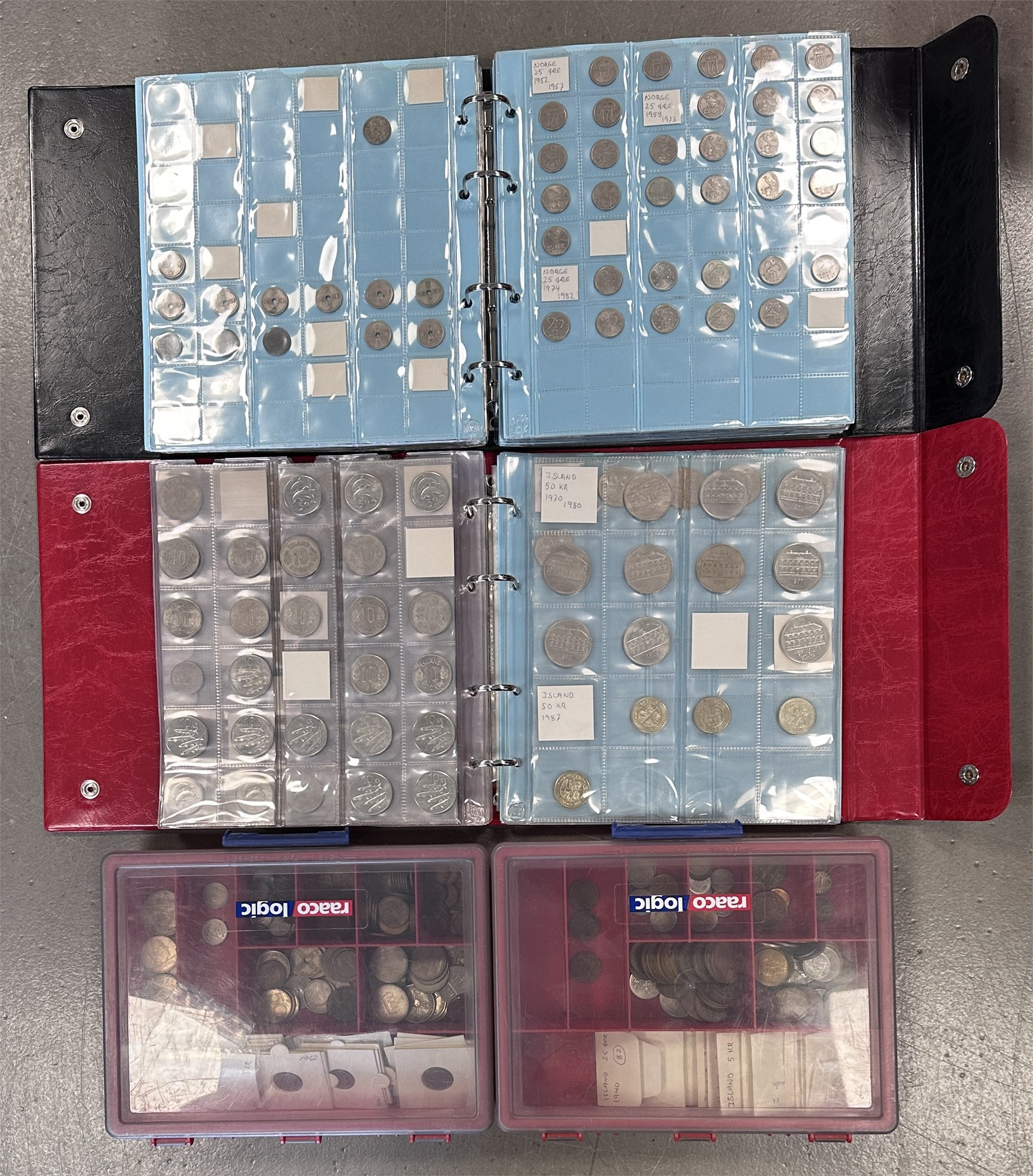 Norge, samling årgangsmønter i album inkl. 2 øre 1876-1907; 5 øre 1875-1907; 10 øre 1897, 1913, 1917, 1919, 1927; 25 øre 1901, 1945; 50 øre 1921 med hul, 1922 med hul, 1923 med hul, 1954; samt Island, samling årgangsmønter i album inkl. 10 aurar 1922-1942; 25 aurar 1922-1933; króna 1925-1940; 2 krónur 1925-1940.
