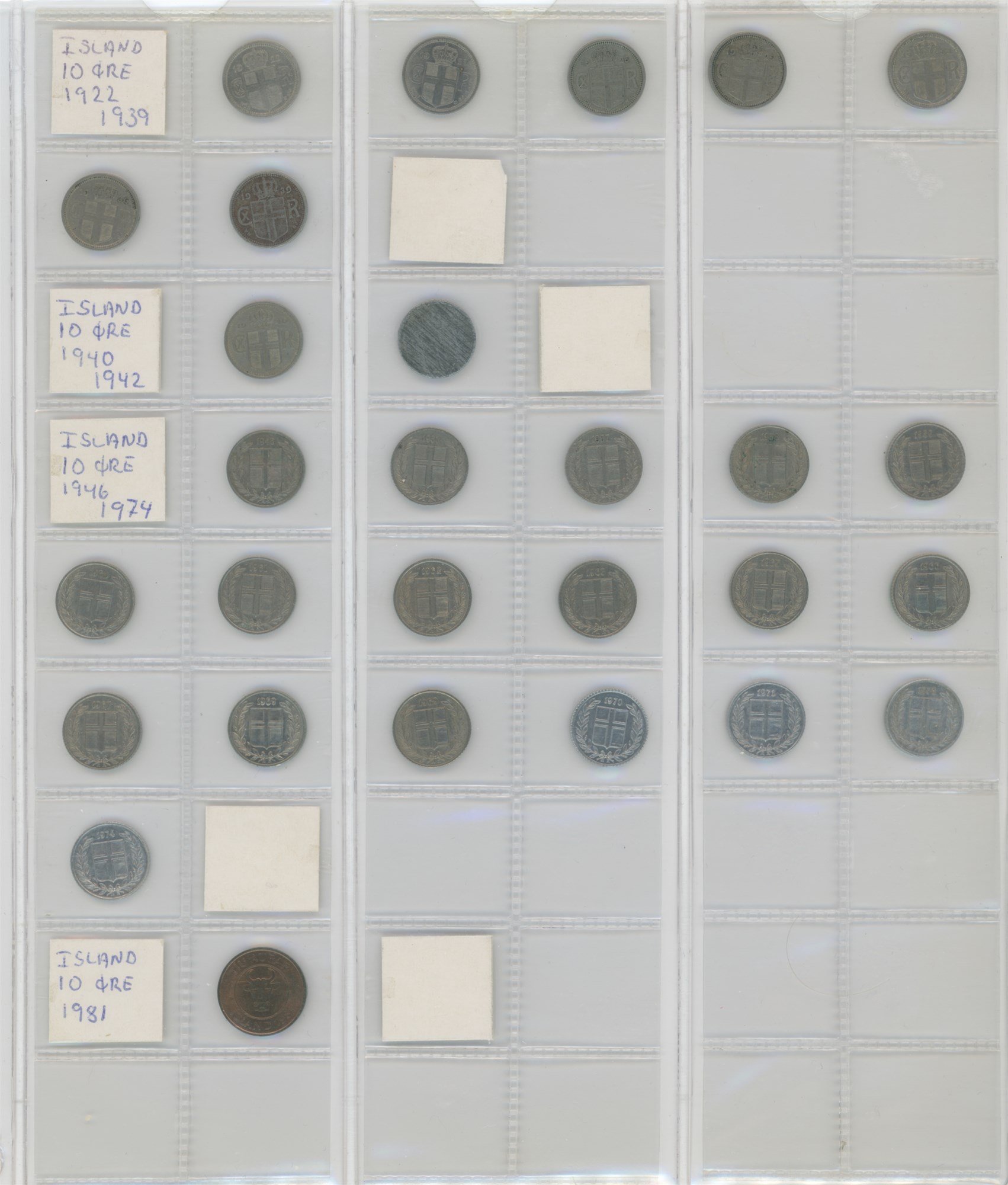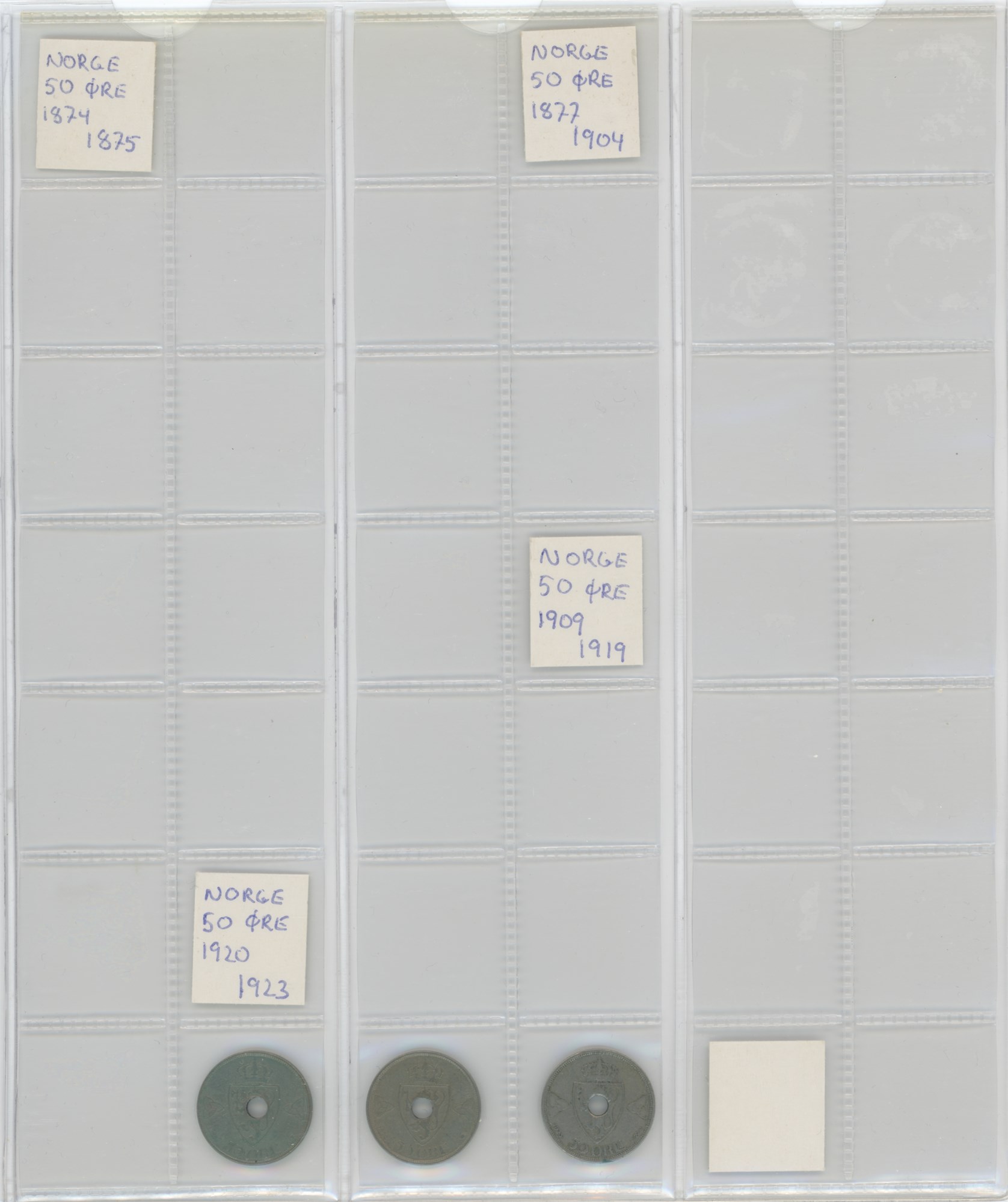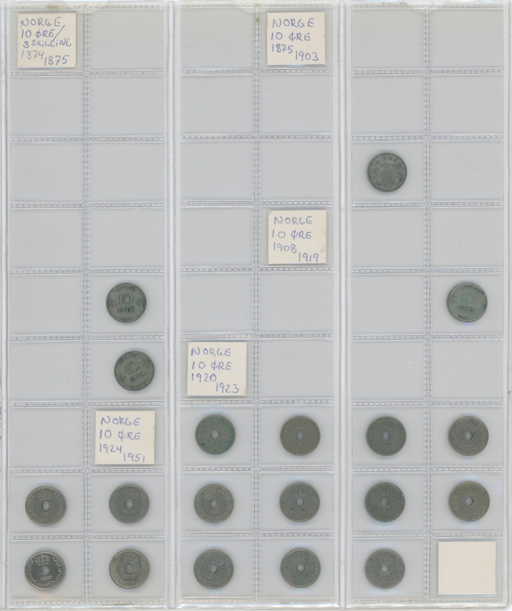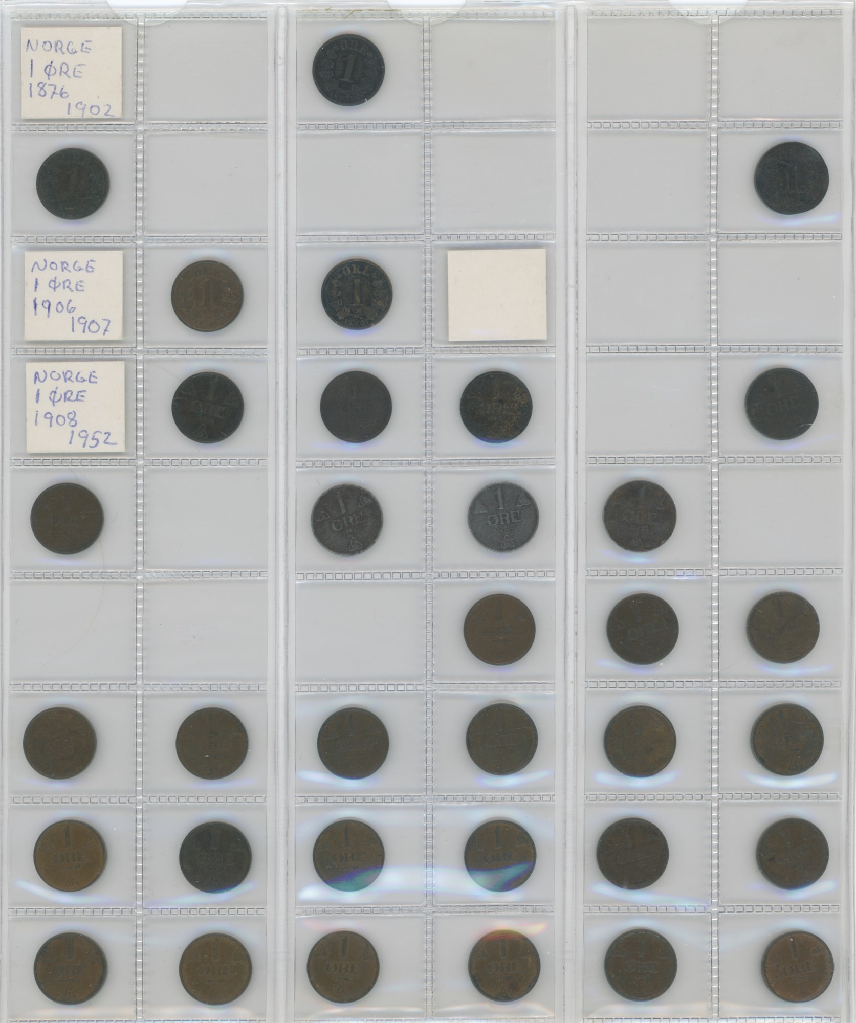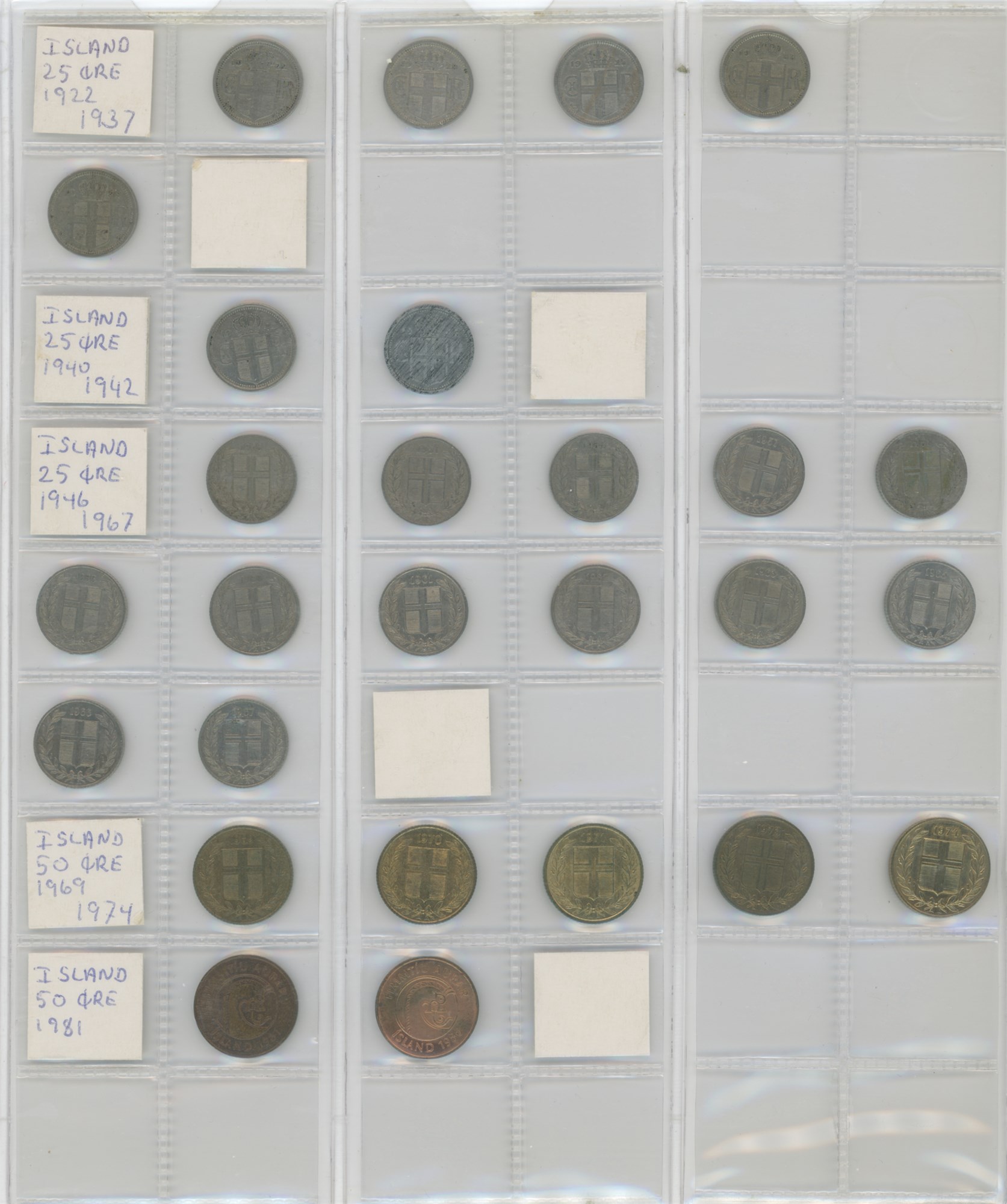 Norge, samling årgangsmønter i album inkl. 2 øre 1876-1907; 5 øre 1875-1907; 10 øre 1897, 1913, 1917, 1919, 1927; 25 øre 1901, 1945; 50 øre 1921 med hul, 1922 med hul, 1923 med hul, 1954; samt Island, samling årgangsmønter i album inkl. 10 aurar 1922-1942; 25 aurar 1922-1933; króna 1925-1940; 2 krónur 1925-1940.