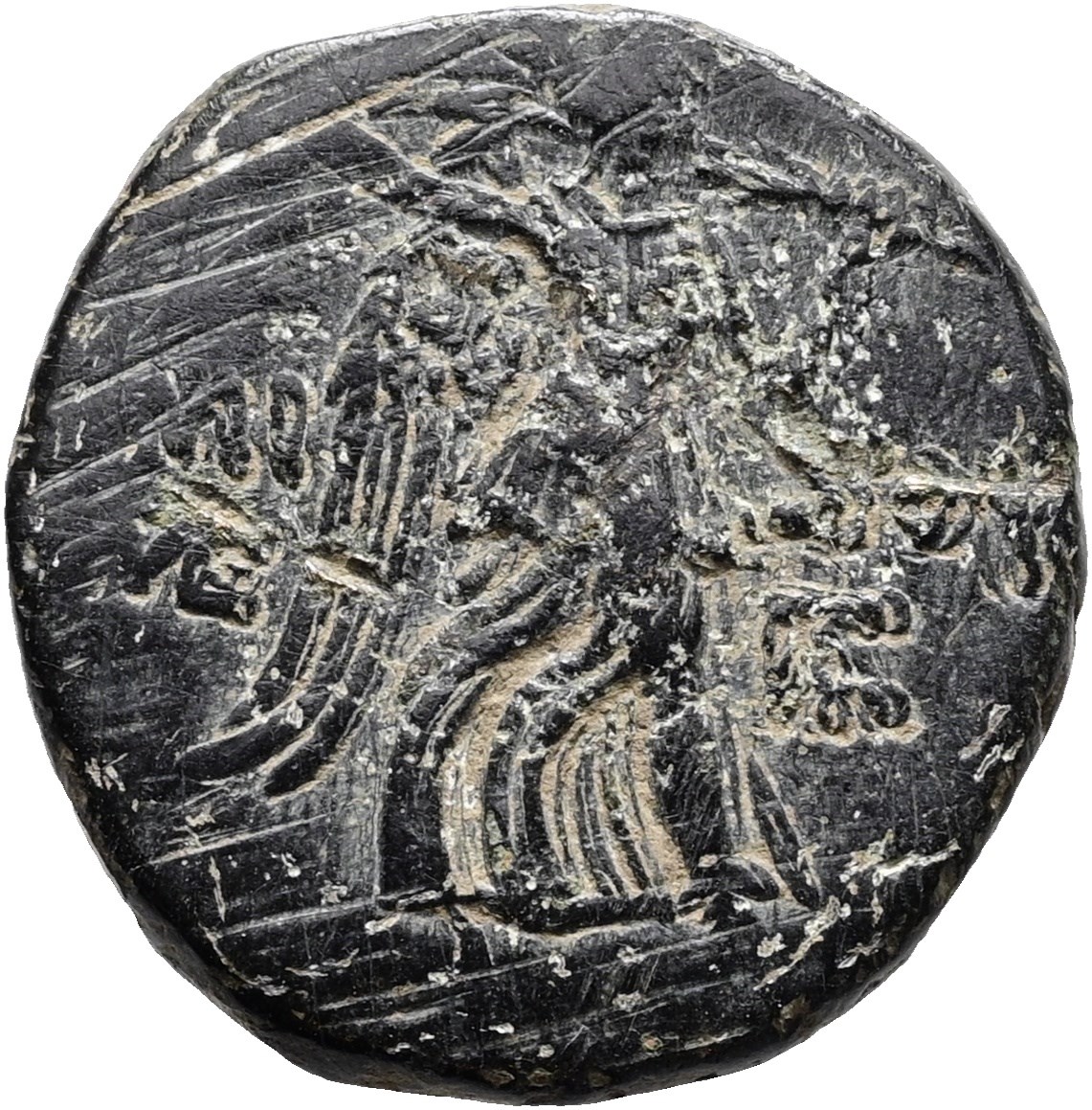 Bronze, 21 mm, facing head of Medusa / Nike advancing right holding palm branch.
