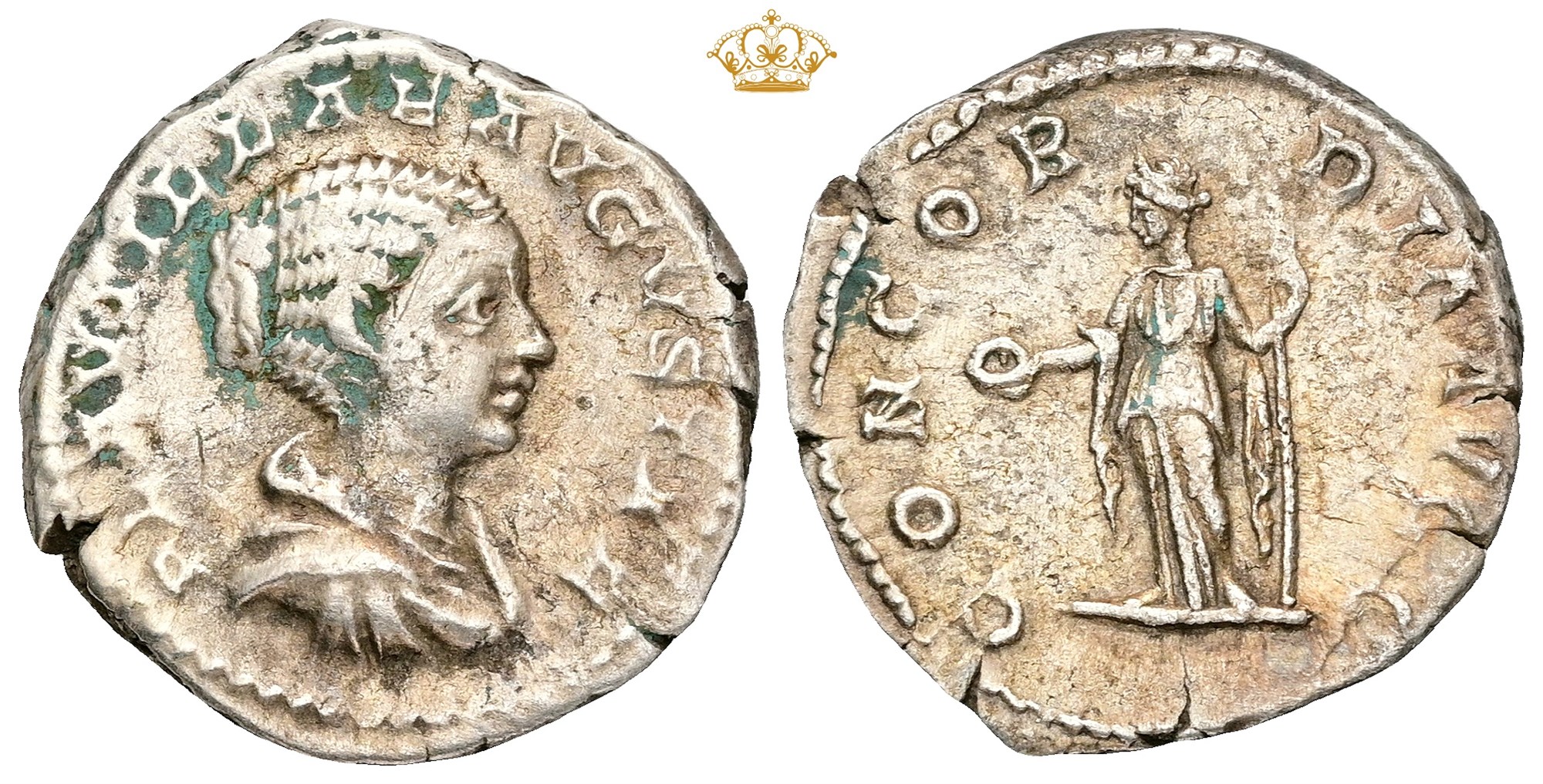 Denarius, Rome. 202-205 AD. PLAVTILLA AVGVSTA, draped bust right. Rev: CONCORDIA AVGG, Concordia standing left, holding patera and sceptre.