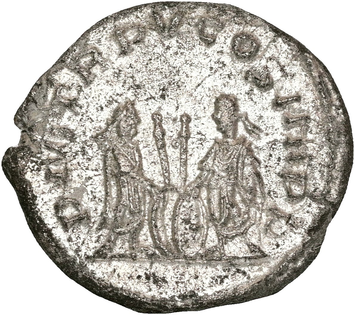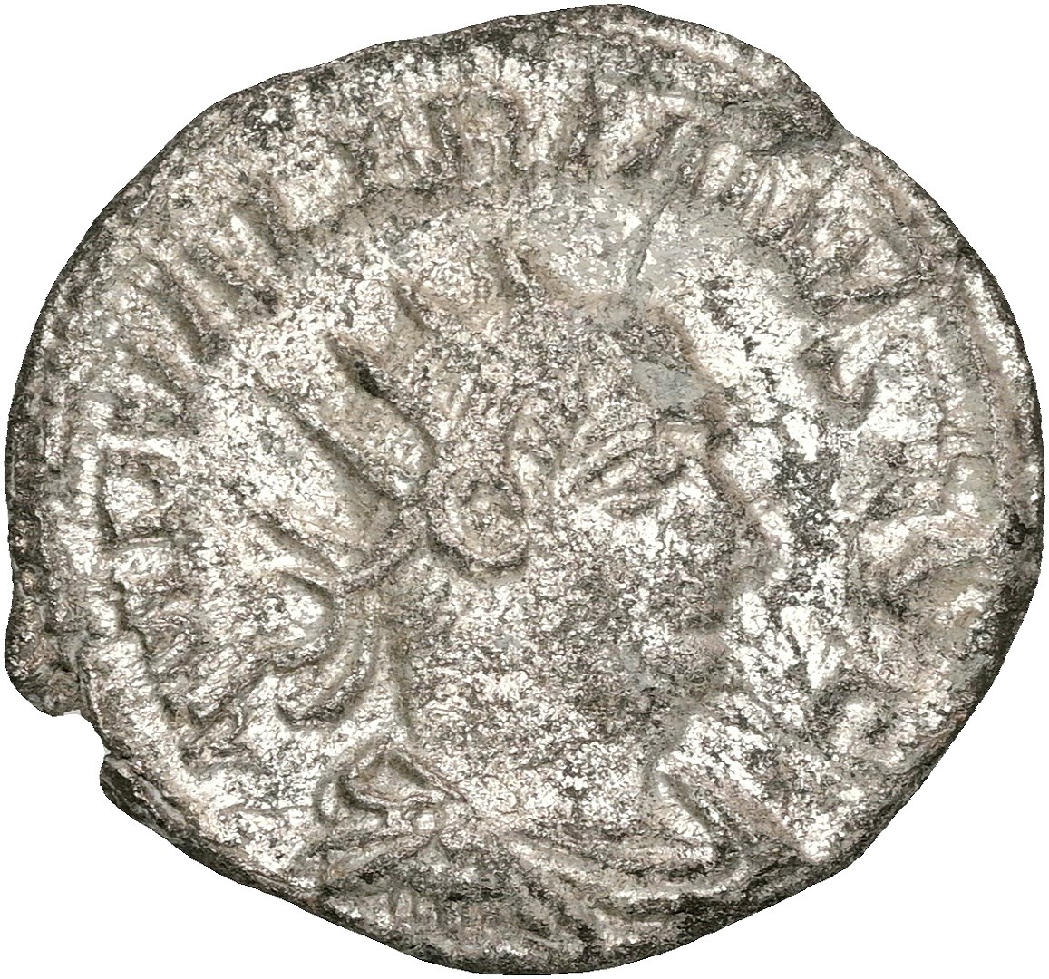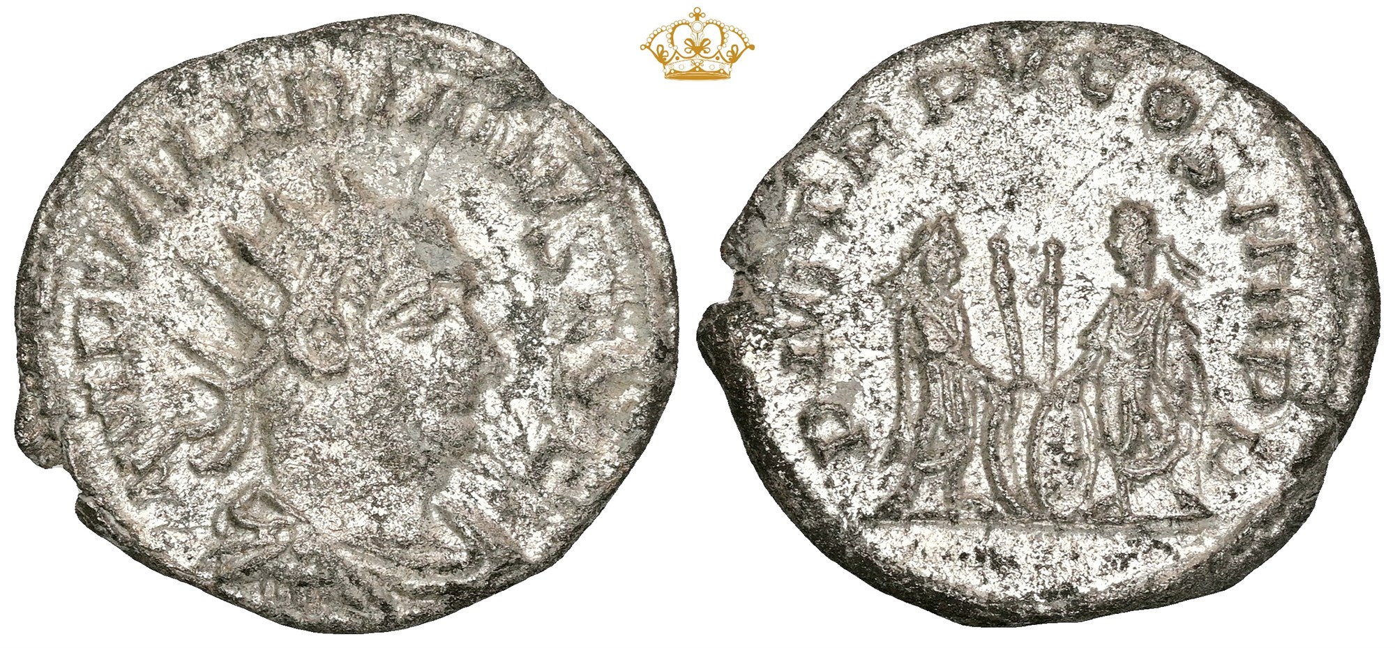 Billon Antoninianus, Antioch. 257 AD. IMP VALERIANVS AVG, radiate, draped and cuirassed bust of Valerian I to right. Rev. P M TR P V COS IIII P P, Valerian and Gallienus, both togate, standing facing one another, each holding shield set on ground; two spears between in background. Rough surface.