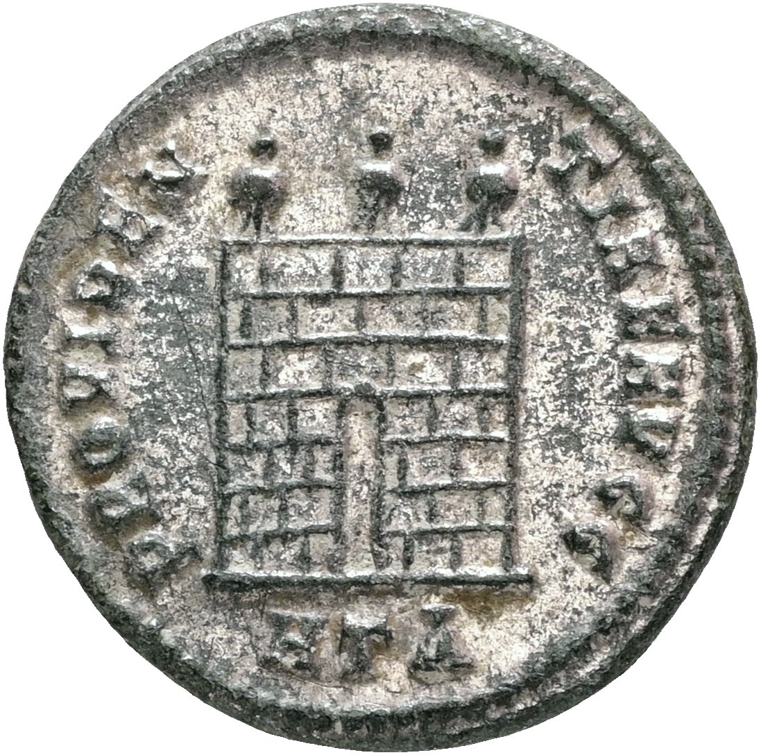 BI Nummus, struck AD 316-317. 1st officina. IMP LICINIVS AVG, laureate and draped bust to left, holding sceptre, globe and mappa / PROVIDENTIAE AVGG, camp gate with three turrets, no doors; HTA in exergue.