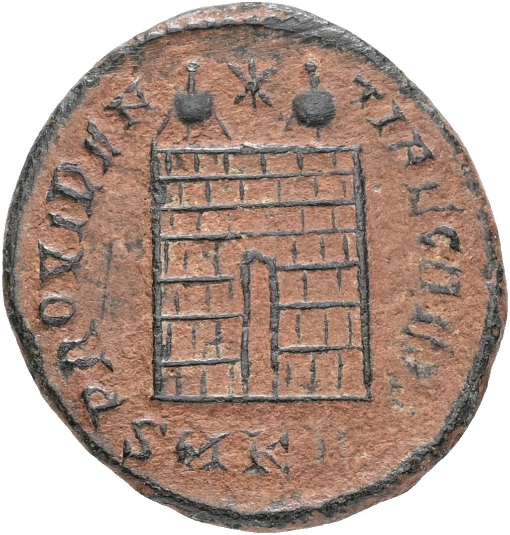 Follis, struck 325-326. CONSTANTINVS IVN NOB C, laureate, draped and cuirassed bust of Constantine II to left. Rev. PROVIDENTIAE CAESS, camp gate with two turrets and star above; SMKΓ in exergue.