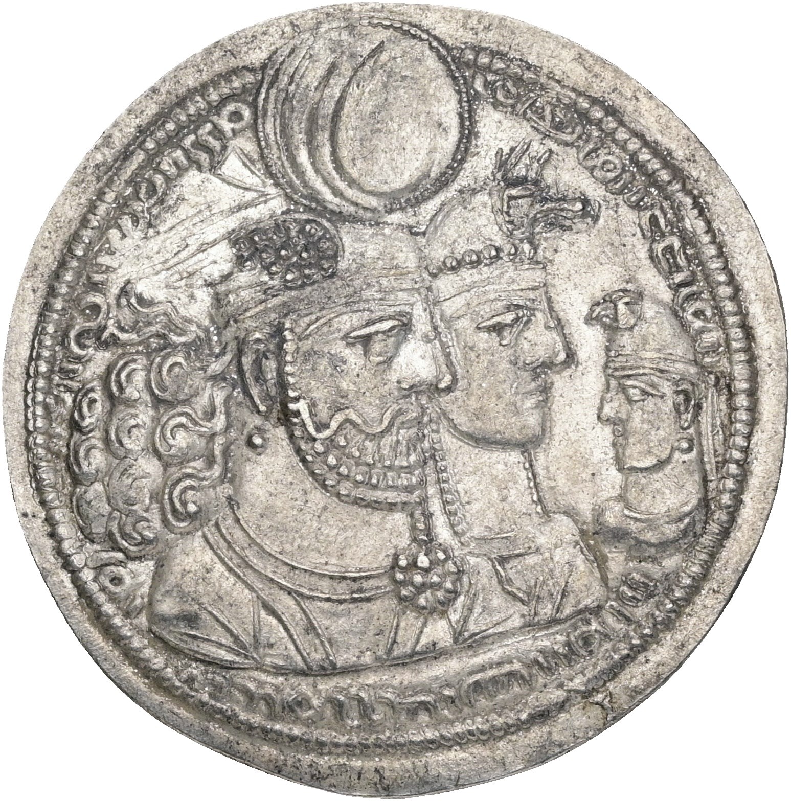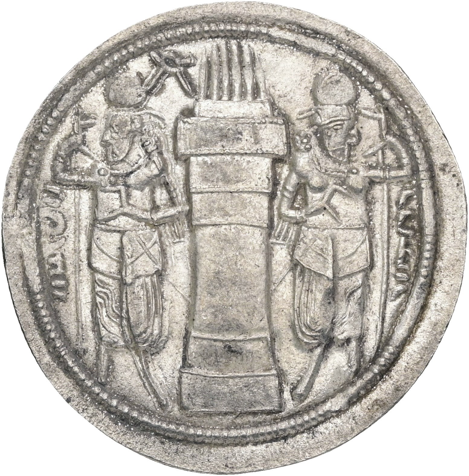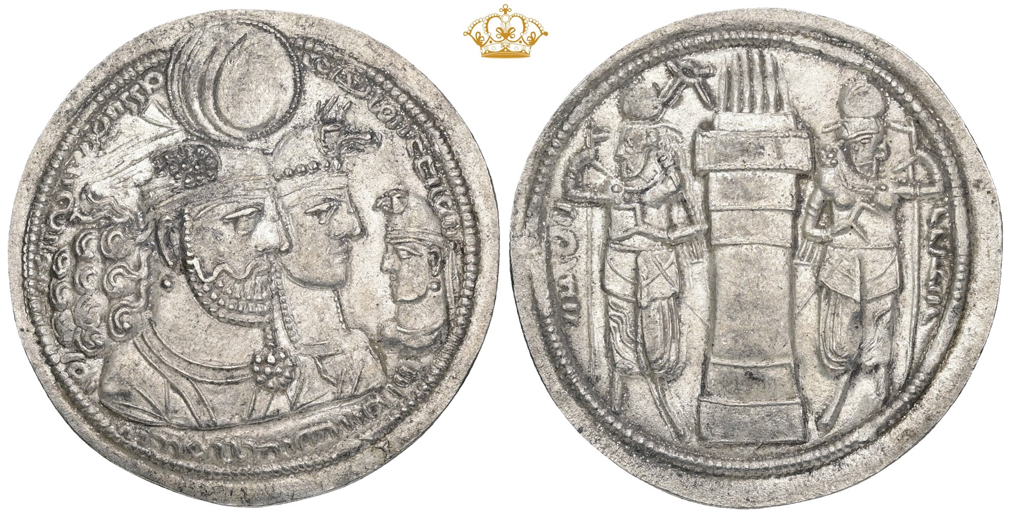 Drachm. King, queen, and prince on obverse. Fire altar between two guardian figures on reverse.