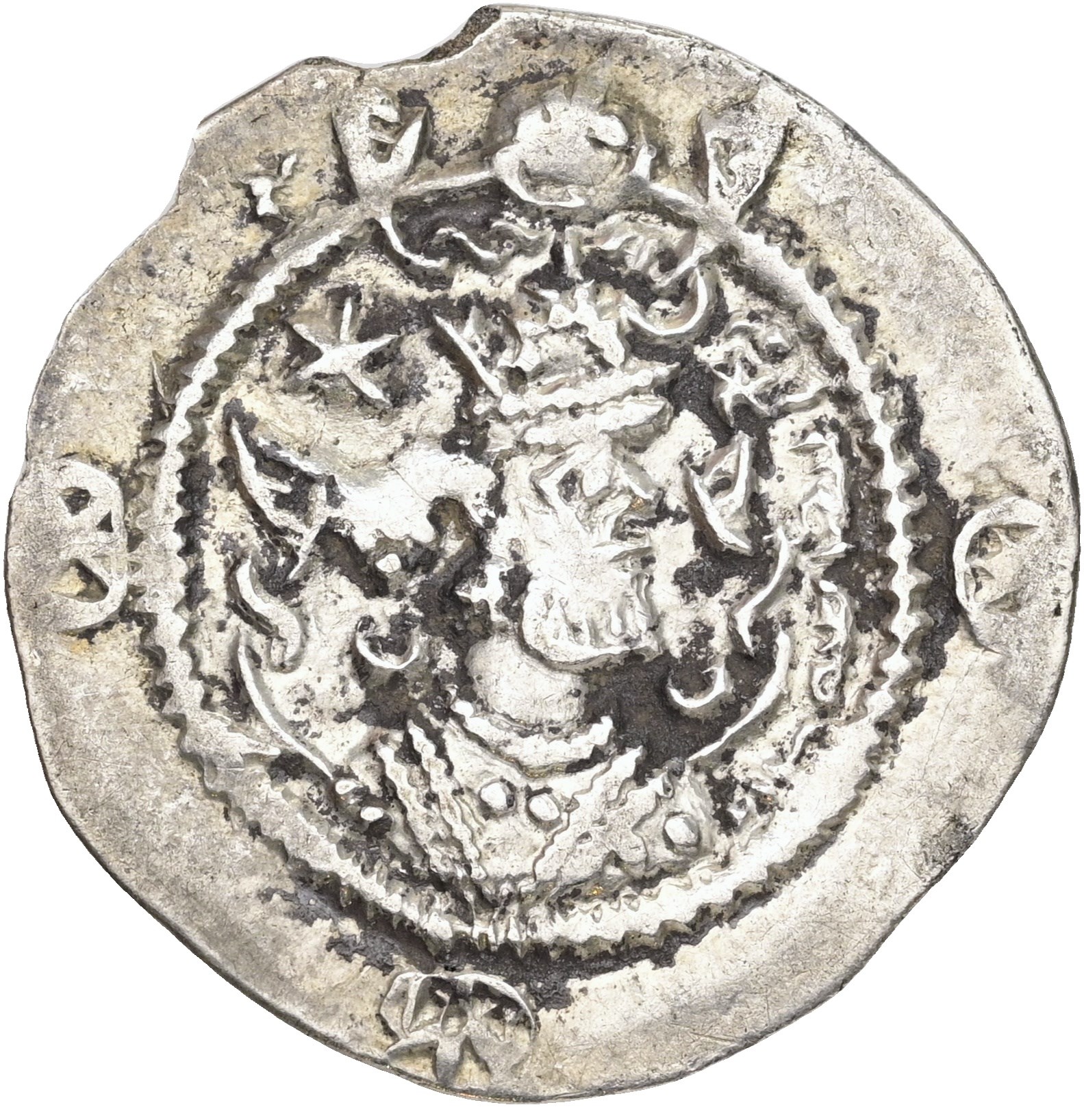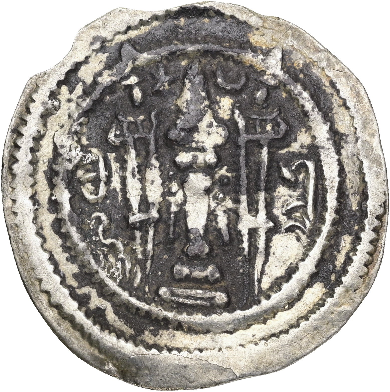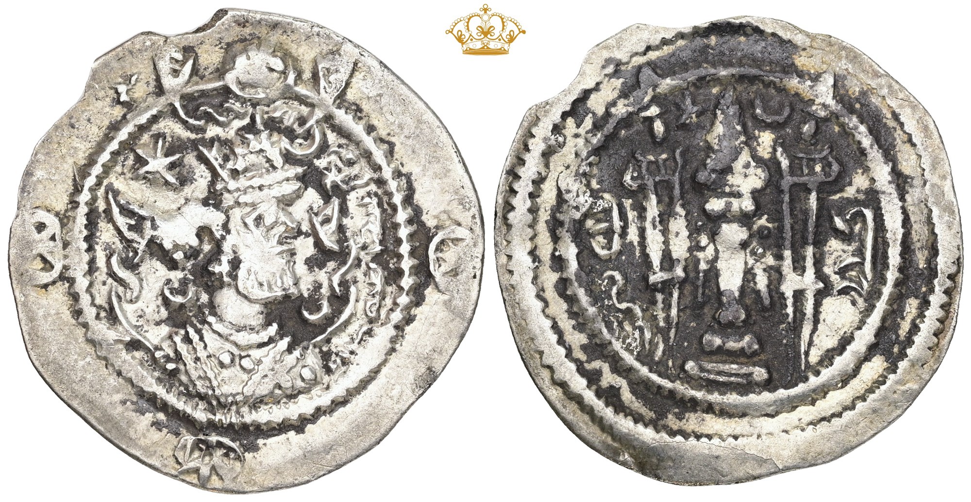 Drachm, year 11. Crowned bust right / Fire altar; attendants flanking. Edge nicks.