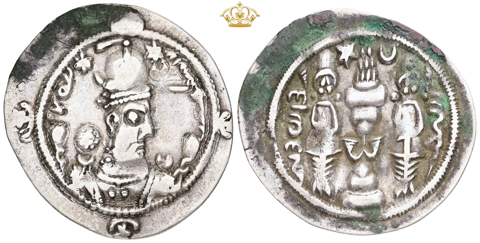 Drachm, year 12. Crowned bust right / Fire altar; attendants flanking.