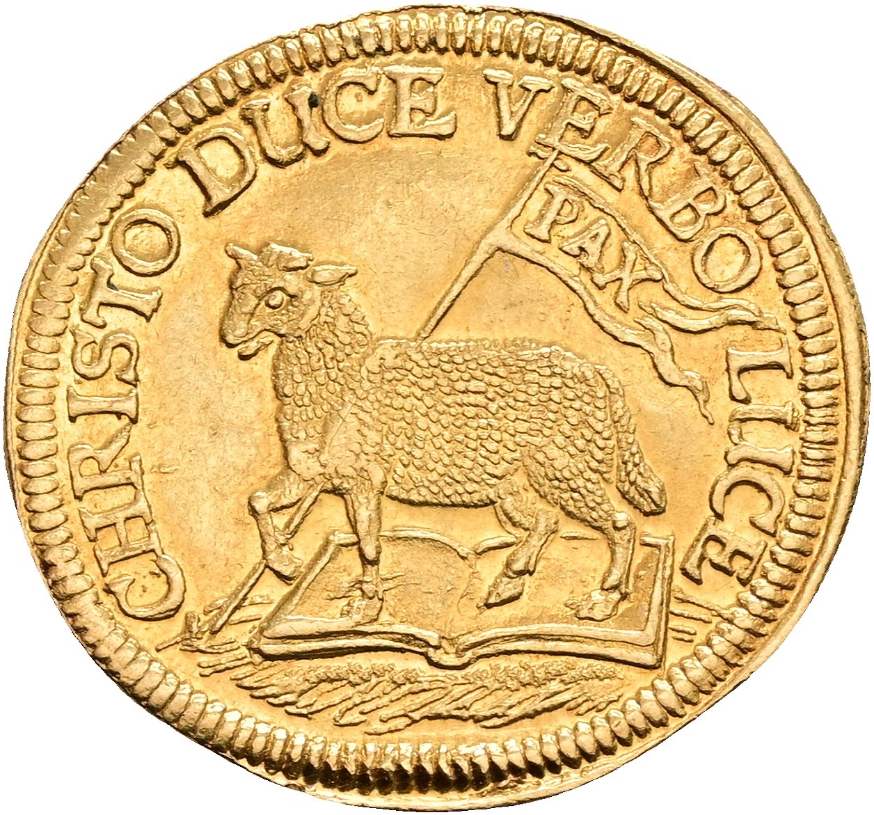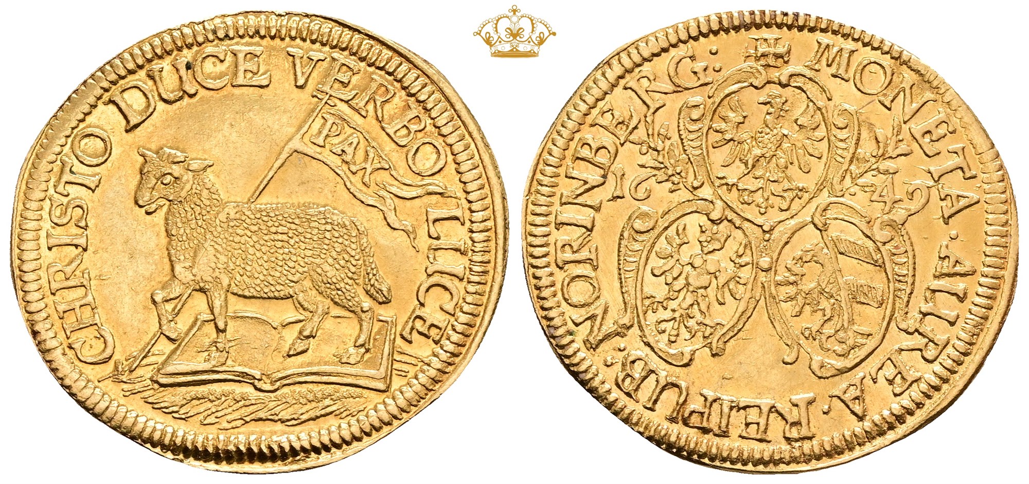 Dukat 1649, on the Peace of Westphalia. Slightly wavy, small egde nick.