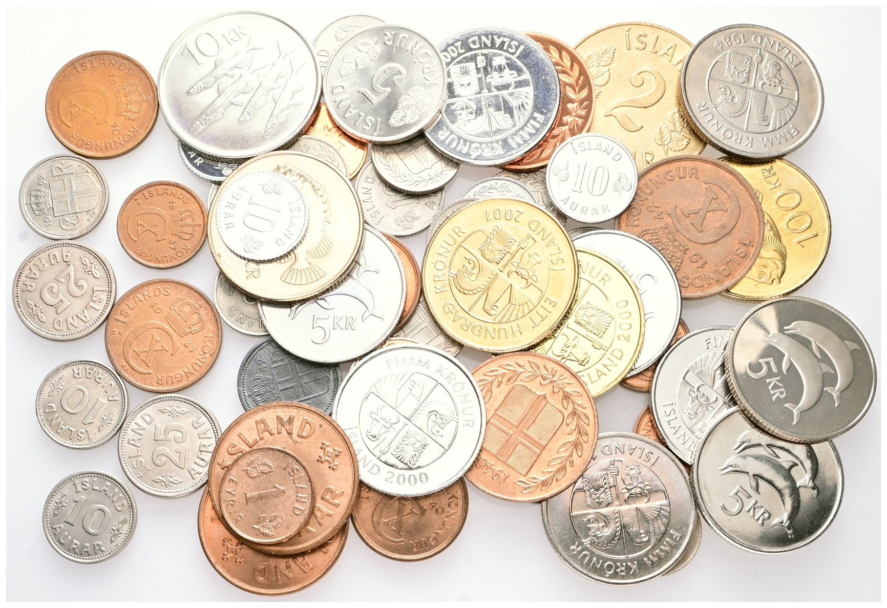 Collection incl. 1 Eyrir 1937; 2 Aurar 1931, 1940; 10 Aurar 1922, 1925, 1940; 25 Aurar 1923, 1937, 1942. In total 54 pcs. in nice condition.
