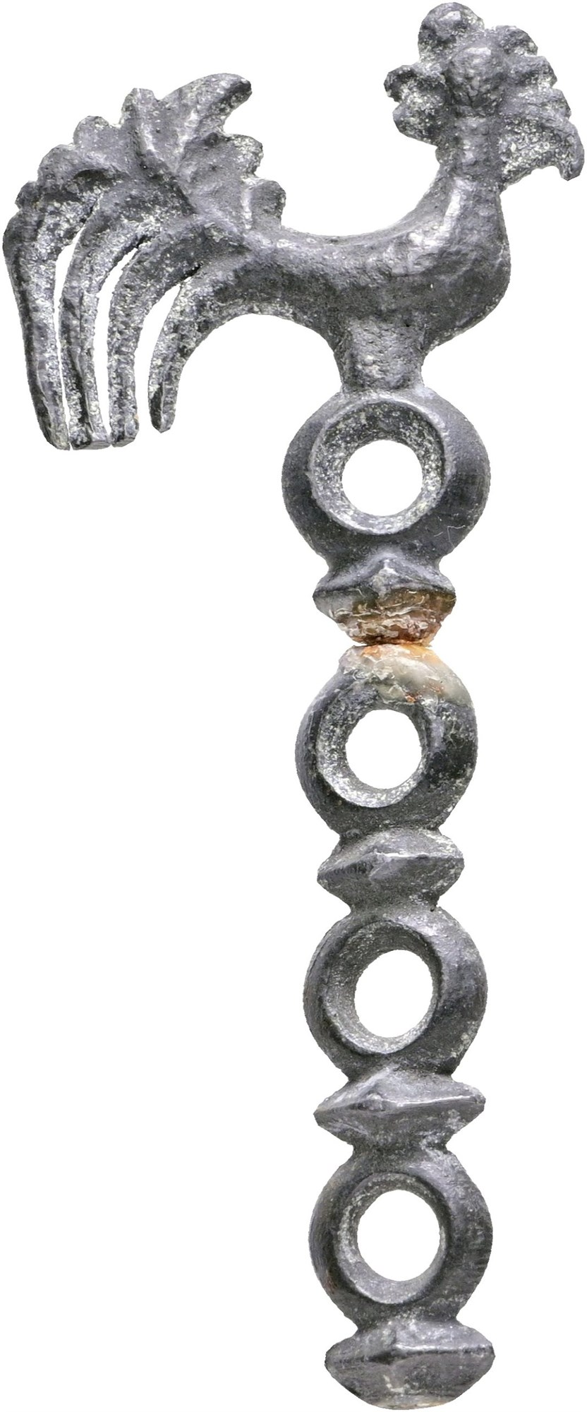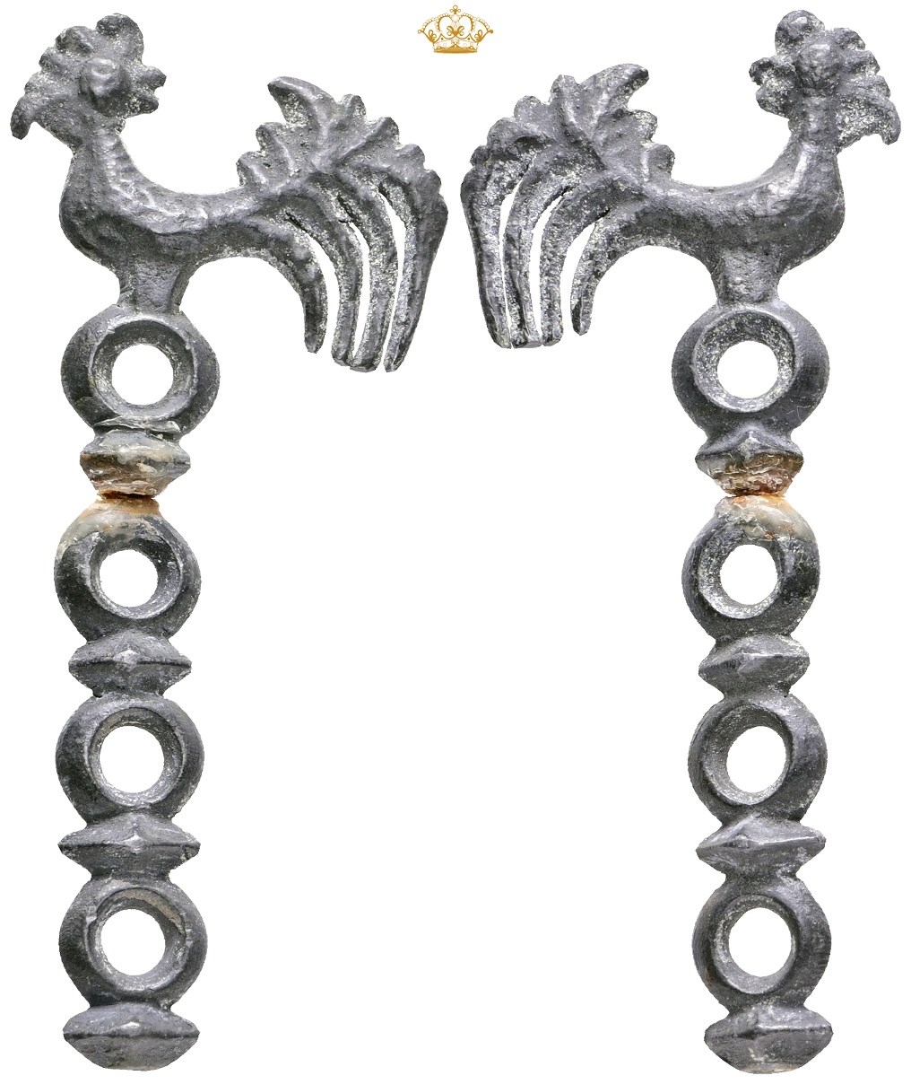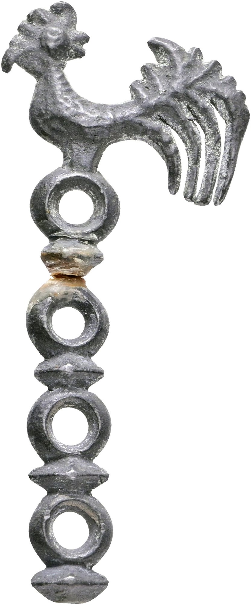 Animal money: tin cockerel / rooster money with four rings of which three are broken off.