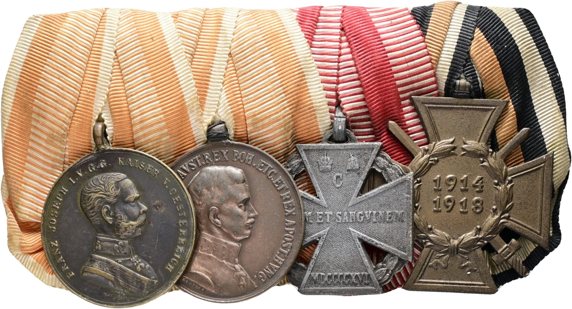 Bar with four orders / medals, World War I / WWI: Austria-Hungary, Franz Joseph, Medal for Bravery "der Tapferkeit"; Charles I, Medal for Bravery "Fortitvdini"; Karl Troop Cross, 'Karl-Truppenkreuz' "vitam et sanguinem"; Germany, The Honour Cross of the World War 1914/1918.