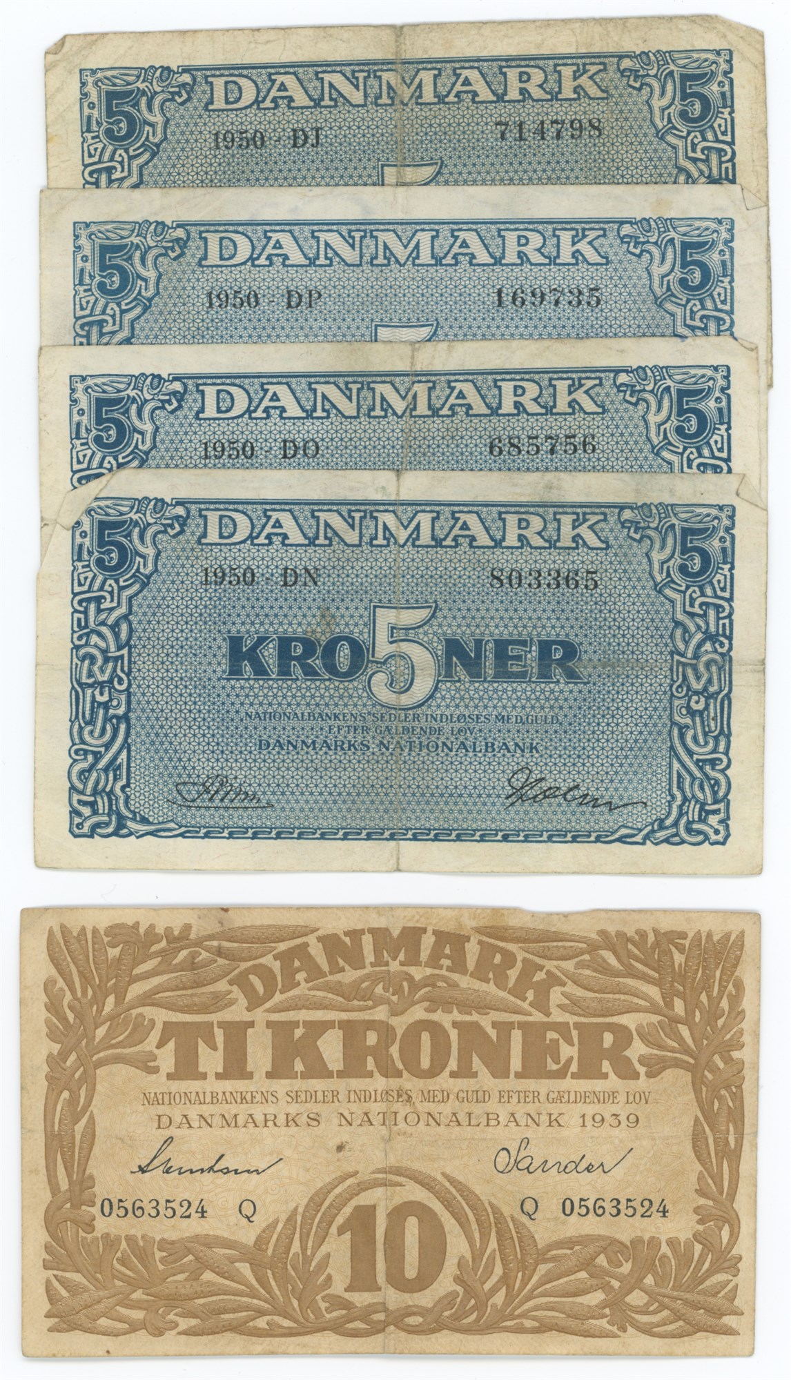 5 kroner 1950, 4 forskellige, samt 10 kroner 1939 Q. (5)
