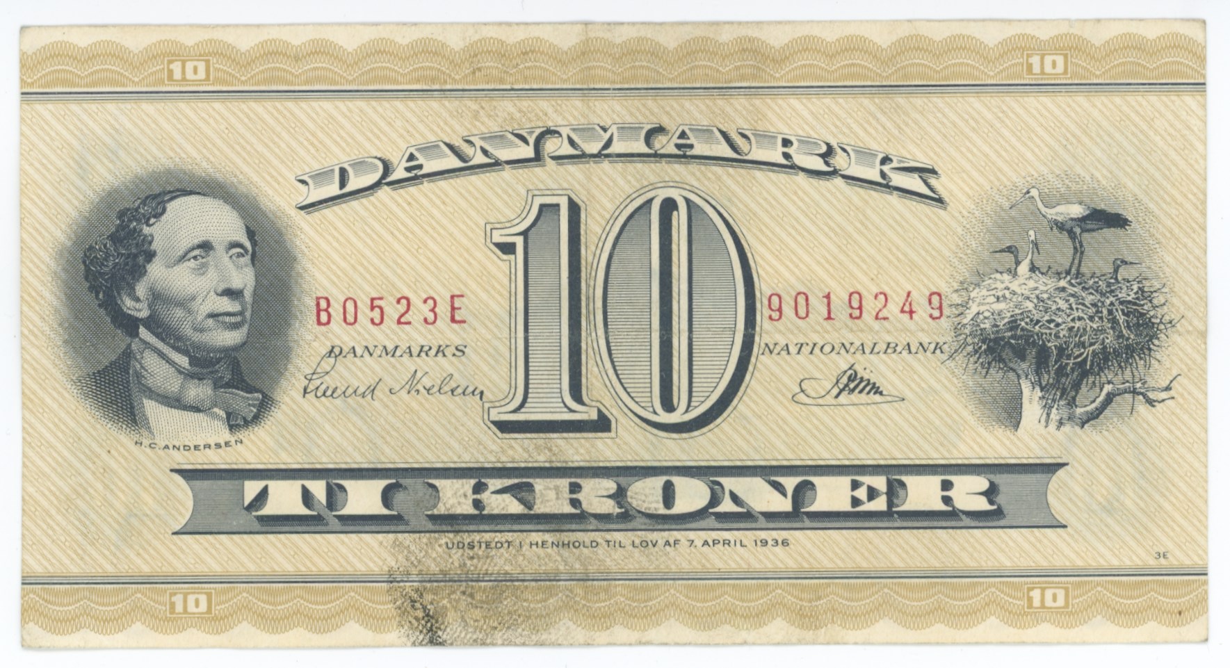 10 kroner 1952 B0, nr. 9019249, Svend Nielsen / Riim, fingeraftryk.
