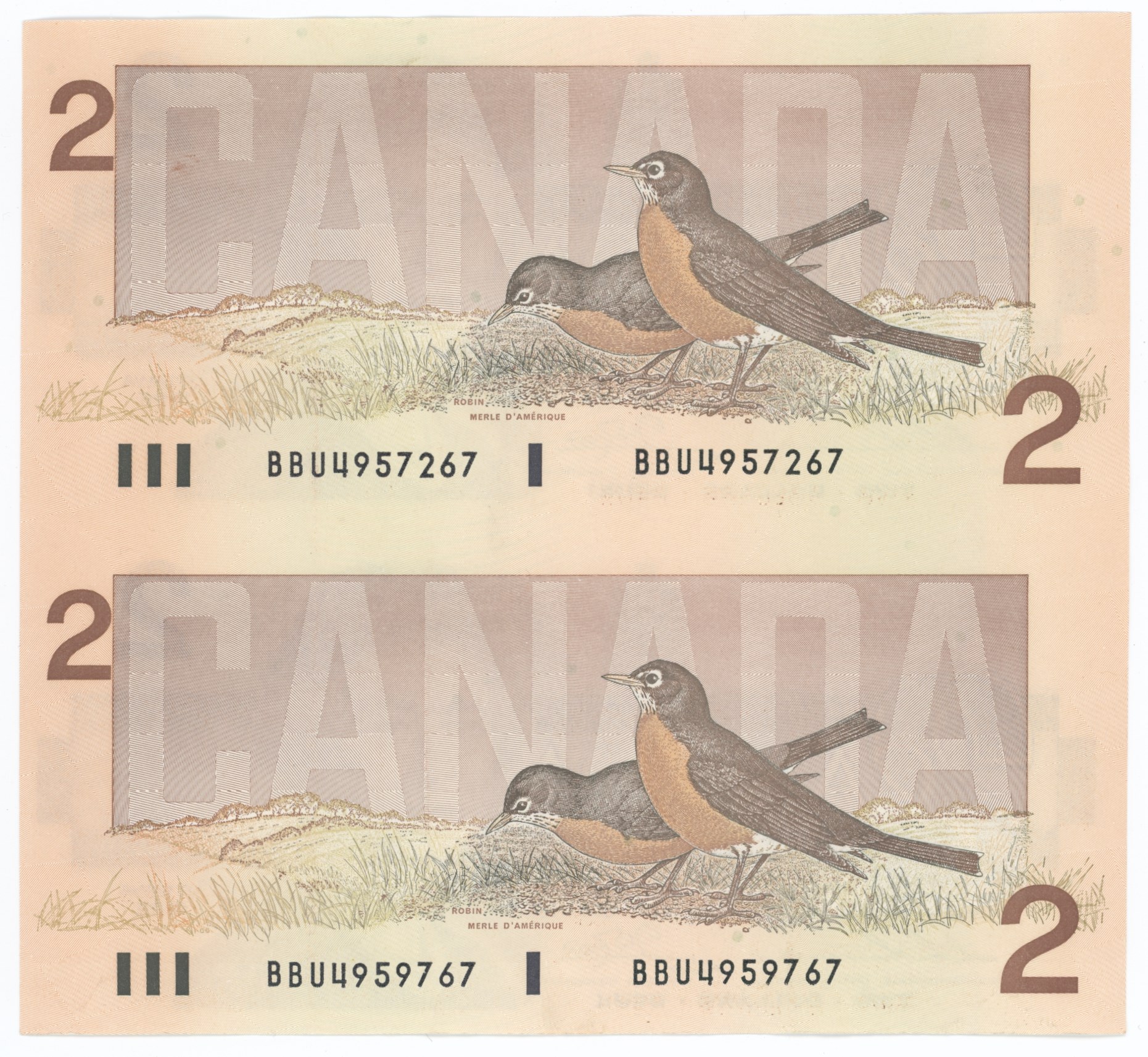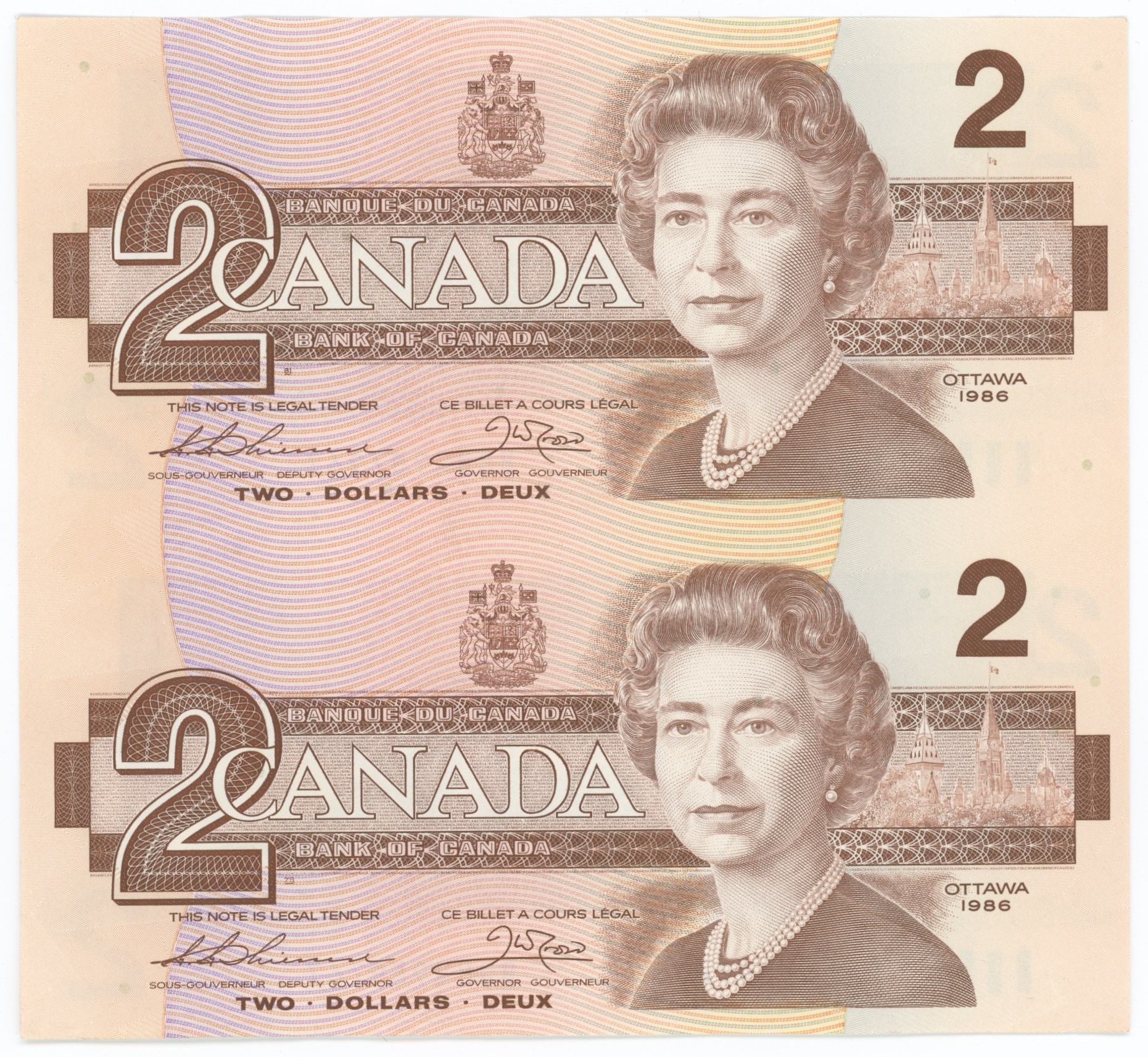 Uncut pair of 2 Dollars 1986.